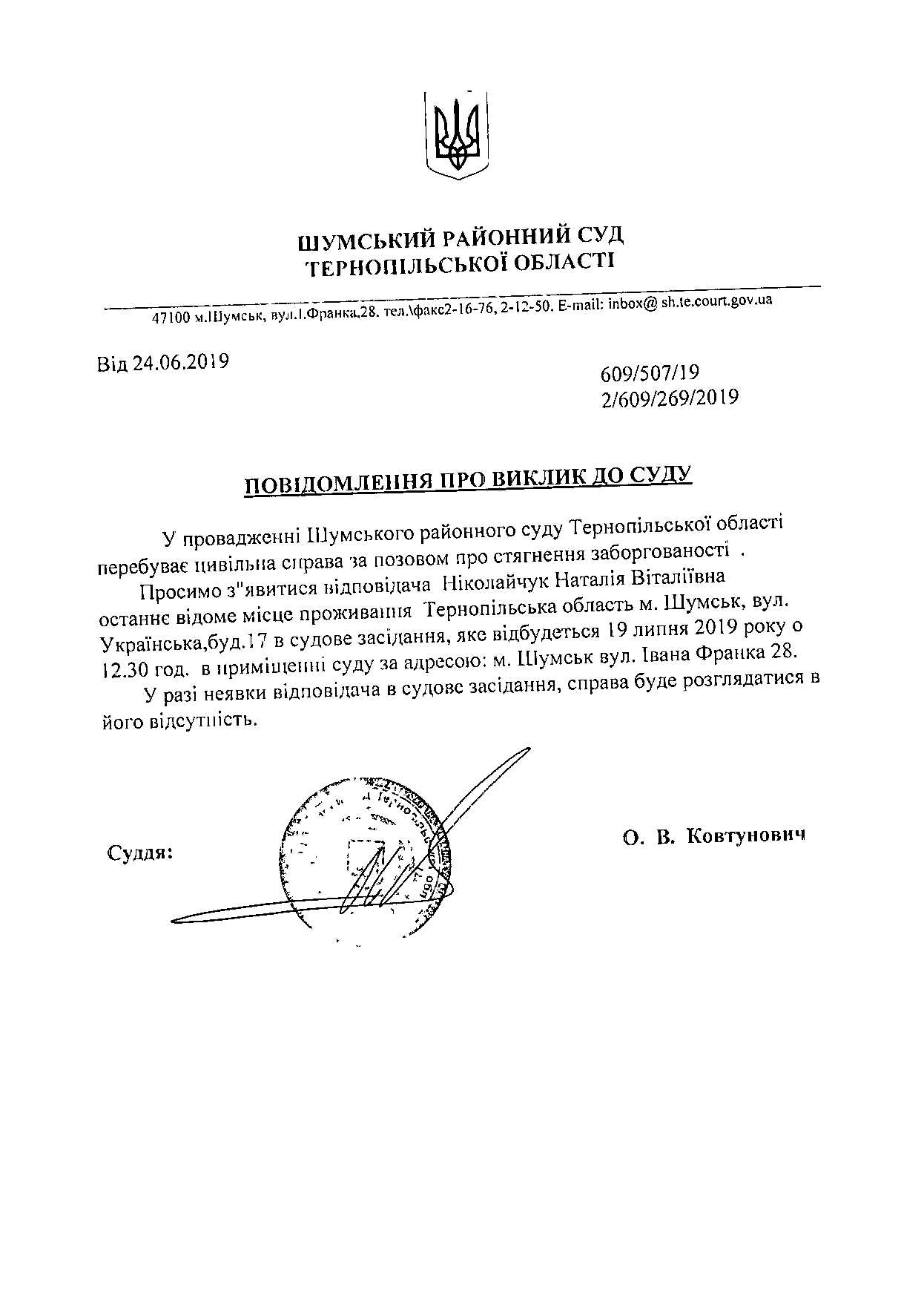 Суд викликає Ніколайчук Наталію Віталіївну на 19 липня 2019 року на 12 годин 30 хвилин