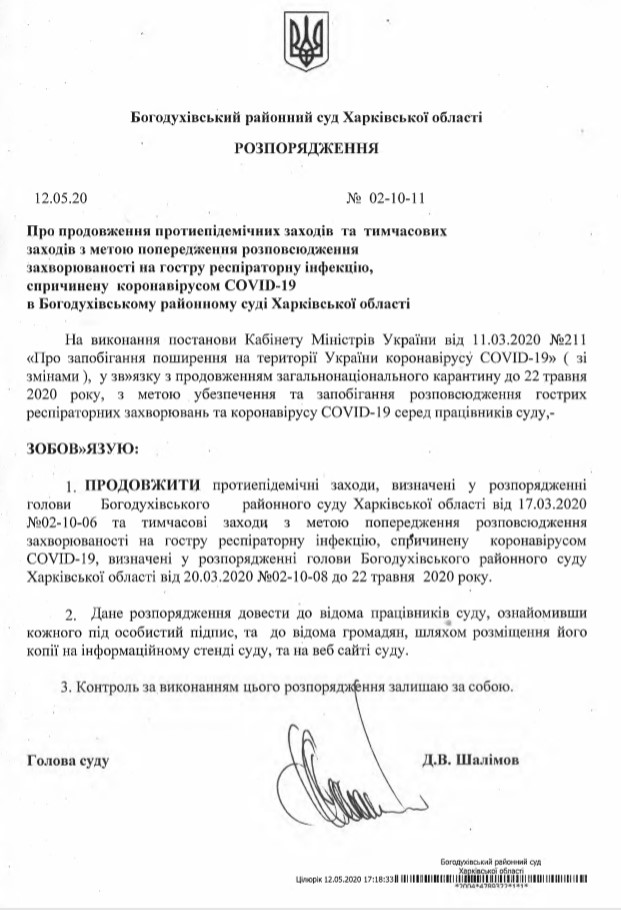 Про продовження протиепідемічних заходів та тимчасових заходів з метою попередження розповсюдження захворюваності на гостру респіраторну інфекцію, спричинену коронавірусом СОУГО-19 в Богодухівському районному суді Харківської області