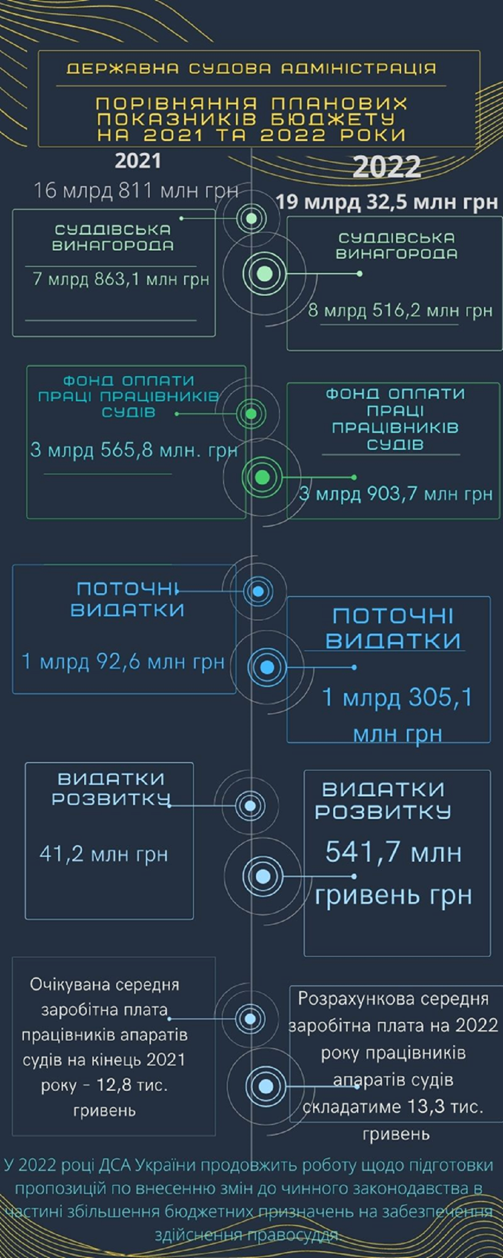 У 2022 році Законом України ″Про Державний бюджет України на 2022 рік″ для здійснення організаційного та фінансового забезпечення діяльності органів судової влади передбачено 19 млрд 32,5 млн грн, що в порівнянні з 2021 роком більше на 2 млрд 221,5 млн гривень.