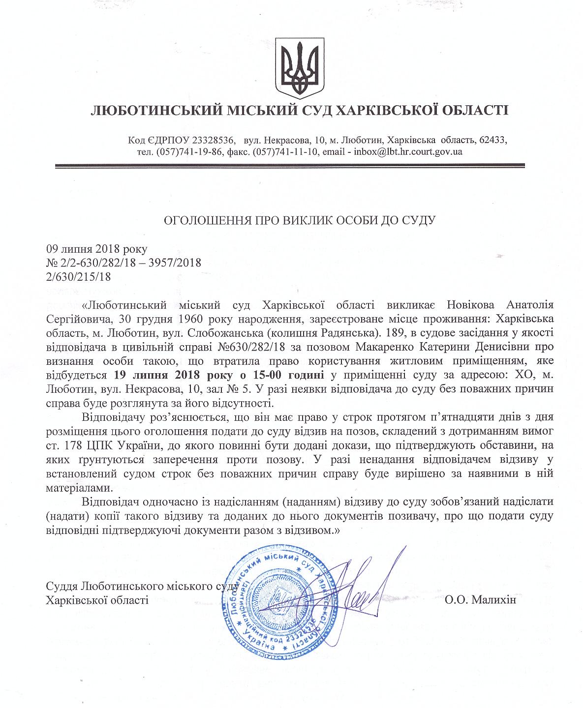 Оголошеня про виклик до суду Новікова Анатолія Сергійовича на 19 липня 2018 року о 15-00 год.