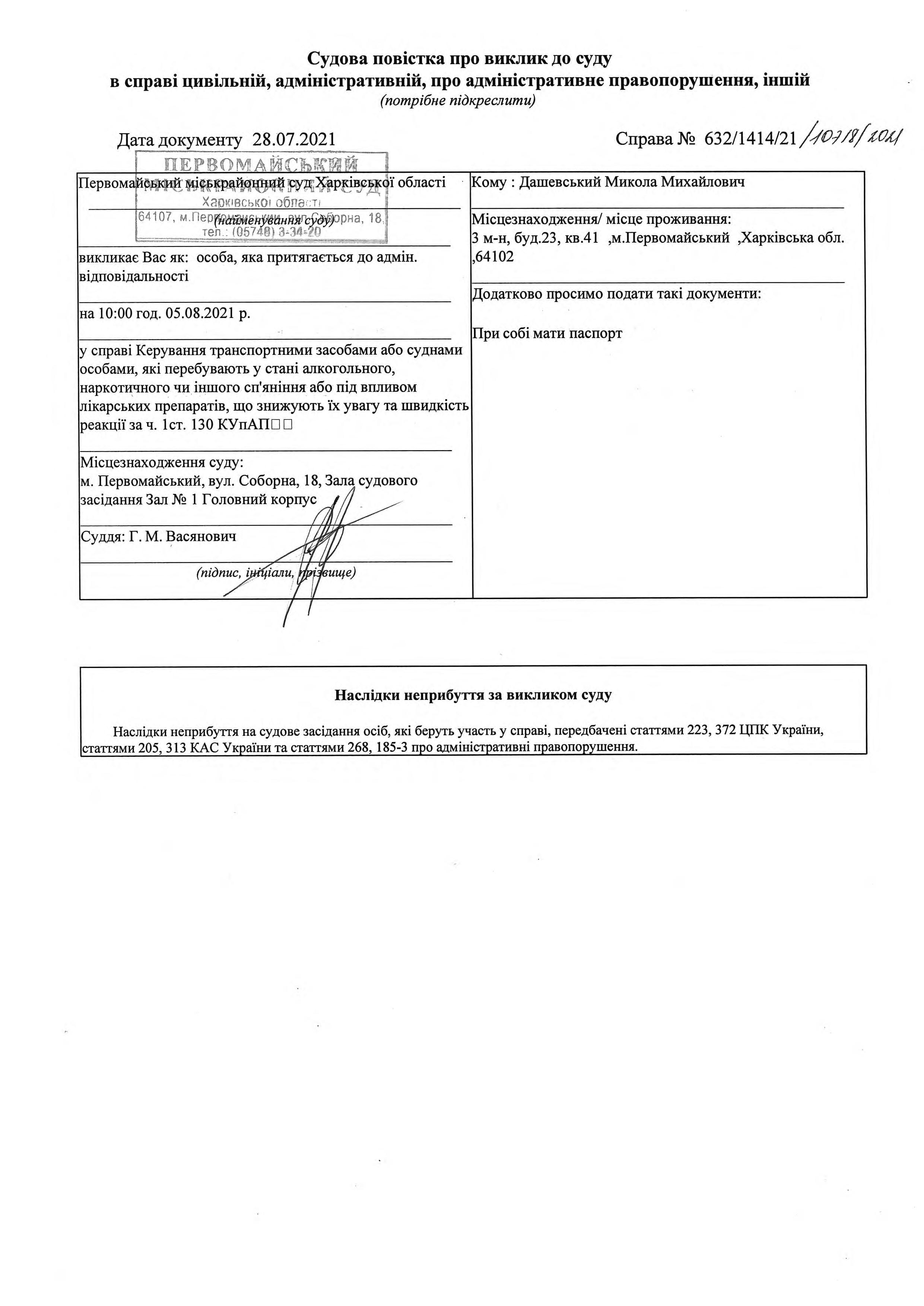 Виклик до суду Дашевського М.М.