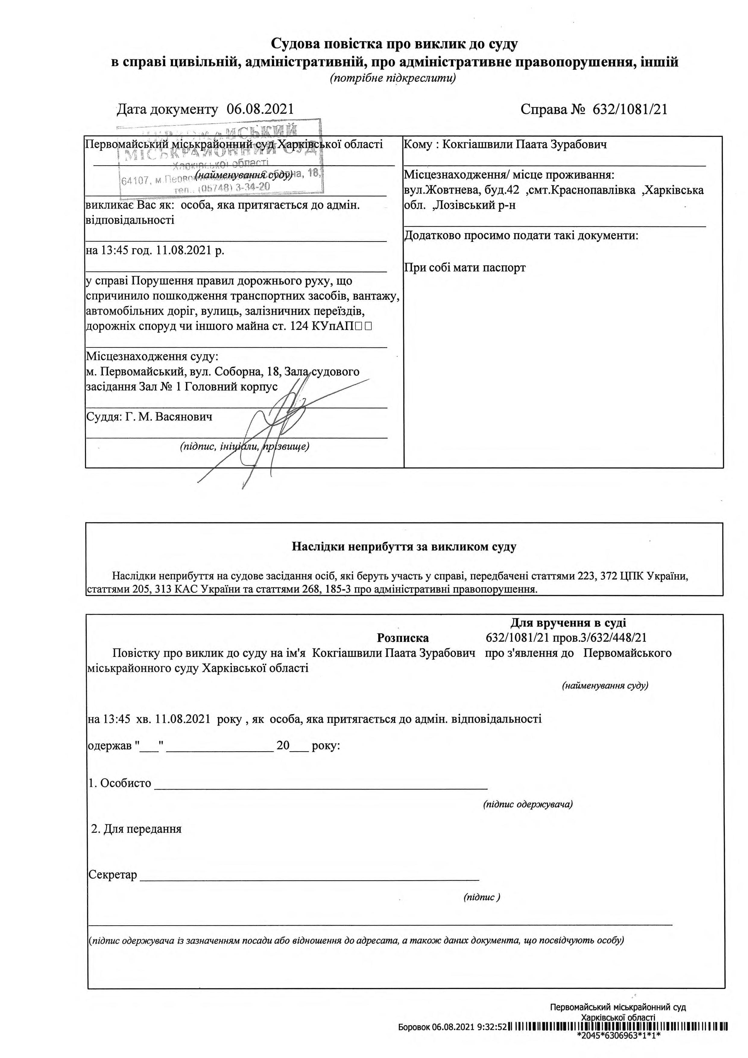 Виклик до суду Кокгіашвили П.З на 11.08.2021 об 13-45