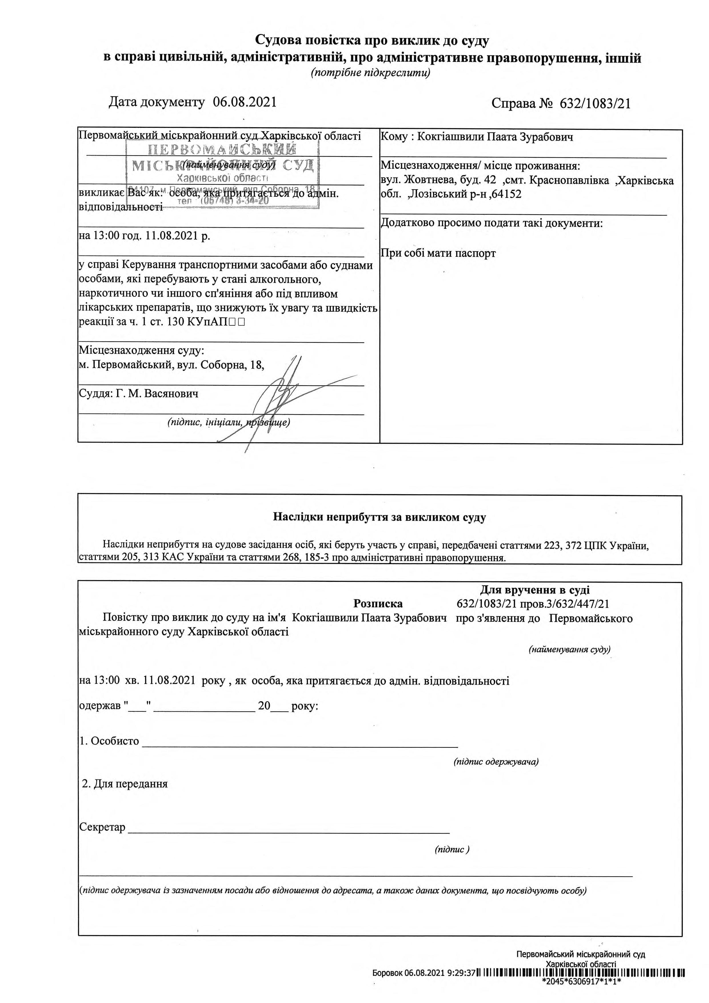 Виклик до суду Кокгіашвили П.З на 11.08.2021 об 13-00