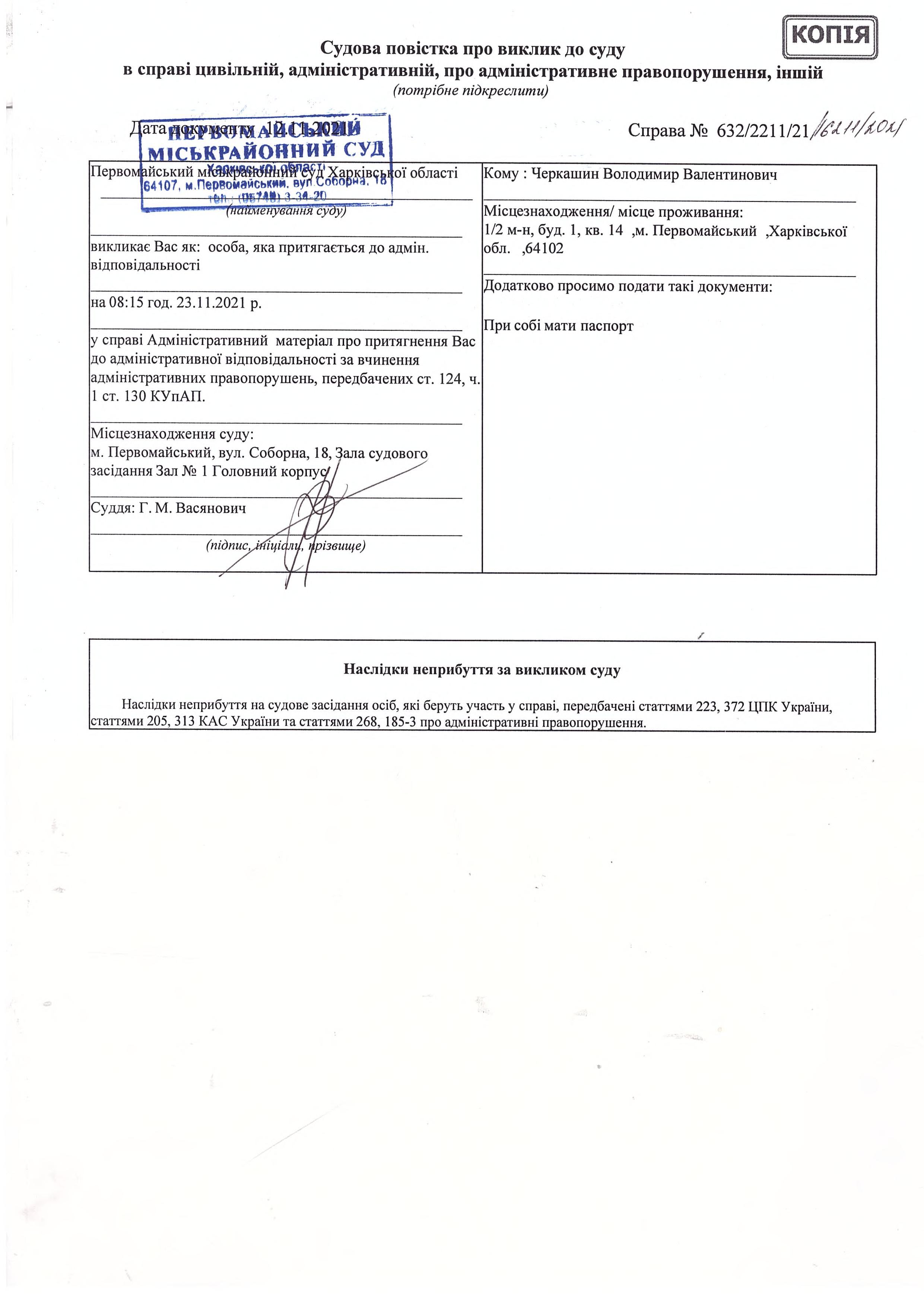 Виклик до суду Черкашина В.В.