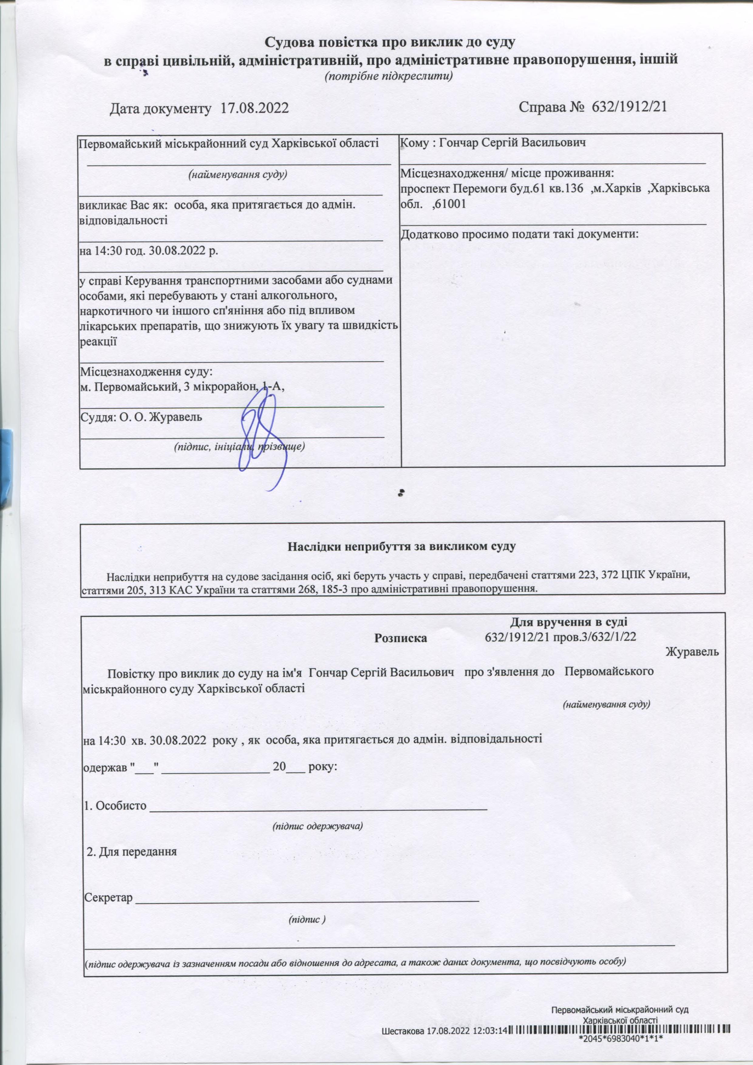 Виклик Гончар С.В.