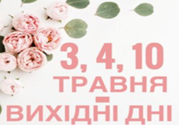 03 травня 2021 року (понеділок), 04 травня 2021 року (вівторок) та 10 травня 2021 року (понеділок) – вихідні дні!