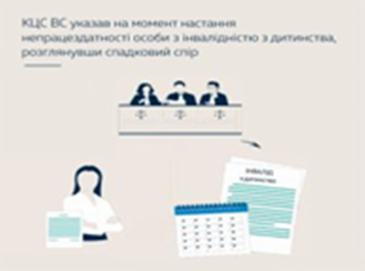 Враховуючи конкретні обставини справи та особливості статусу позивачки, Верховний Суд наголосив, що вона станом на день відкриття спадщини була непрацездатною в силу стану свого здоров’я, такий її стан відповідним висновком підтверджено ретроспективно, тобто встановлено за минулий період, оскільки визначено, що особа отримала інвалідність у дитинстві, відповідно, перебувала в такому стані до досягнення повноліття, що й спричинило її непрацездатність після досягнення повноліття.