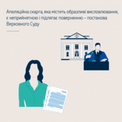 ВС погодився з висновками суду апеляційної інстанції, що зазначені в апеляційній скарзі висловлювання на адресу прокурорів, суддів та суду є образливими, а апеляційна скарга, що містить такі висловлювання, є неприйнятною. Учасники справи зобов’язані виявляти повагу до суду та до інших учасників судового процесу. Заяви та скарги, що подаються до суду, мають відповідати вимогам чинного законодавства. У тексті цих документів не можна використовувати образливі та лайливі слова, символи, зокрема для надання особистих характеристик учасникам справи, іншим учасникам судового процесу, їх представникам і суду. У протилежному випадку це свідчить про очевидну неповагу до честі, гідності цих осіб з боку автора документа. Такі дії суперечать основним засадам і завданням судочинства та можуть бути визнані судом як зловживання процесуальними правами.