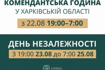 Розпорядженням начальника Харківської обласної військової адміністрації від 19.08.2022 № 131 В, на території Харківської області запроваджено комендантську годину з 19:00 23.08.2022 до 07:00 25.08.2022.