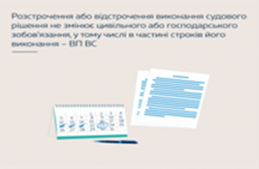 Таким чином, розстрочення або відстрочення виконання судового рішення не змінює цивільного або господарського зобов’язання, у тому числі в частині строків його виконання. Натомість таке розстрочення або відстрочення унеможливлює примусове виконання судового рішення до спливу строків, визначених судом.