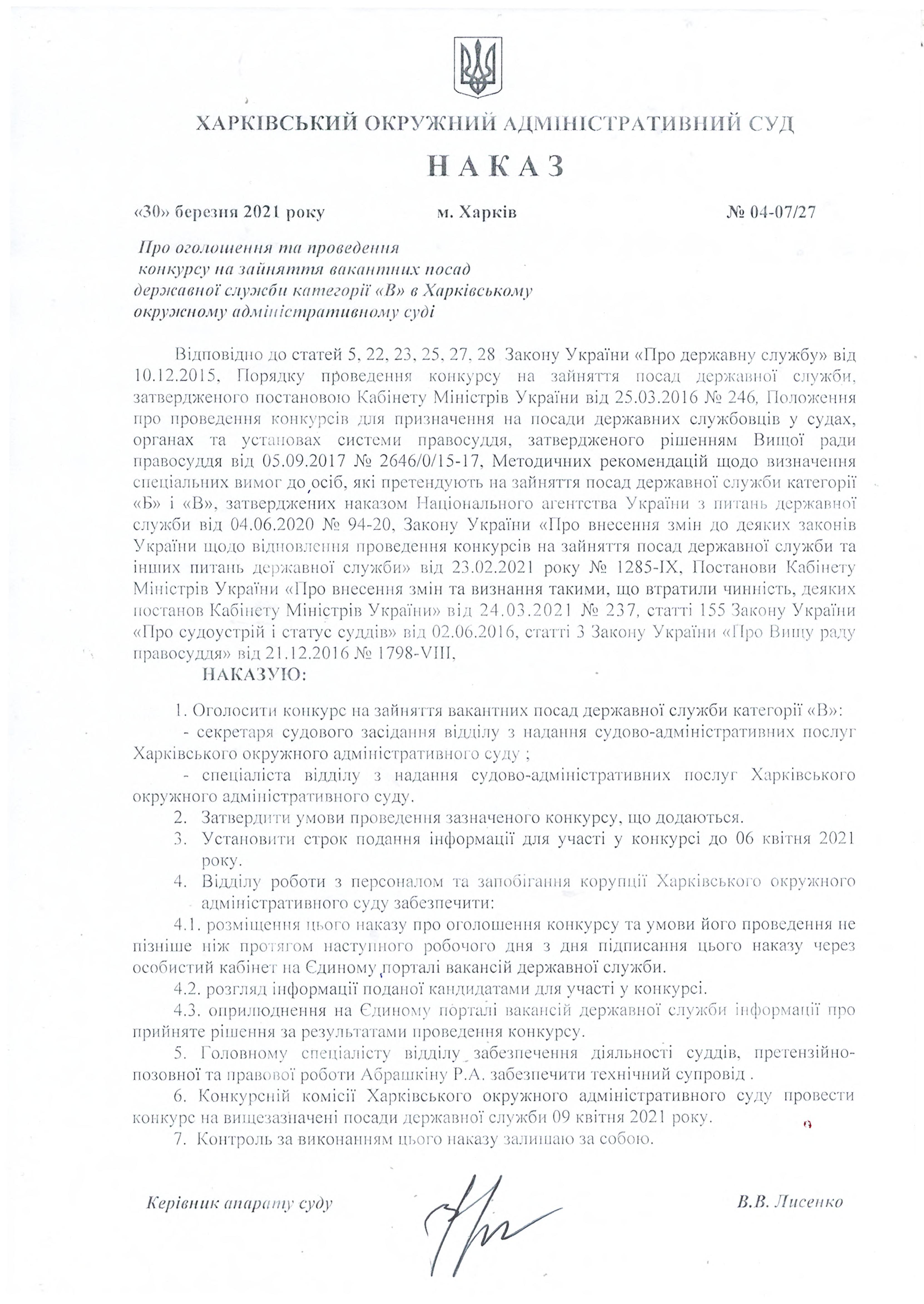 Наказ про оголошення та проведення конкурсу на зайняття вакантних посад державної служби категорії "В" в Харківському окружному адміністративному суді