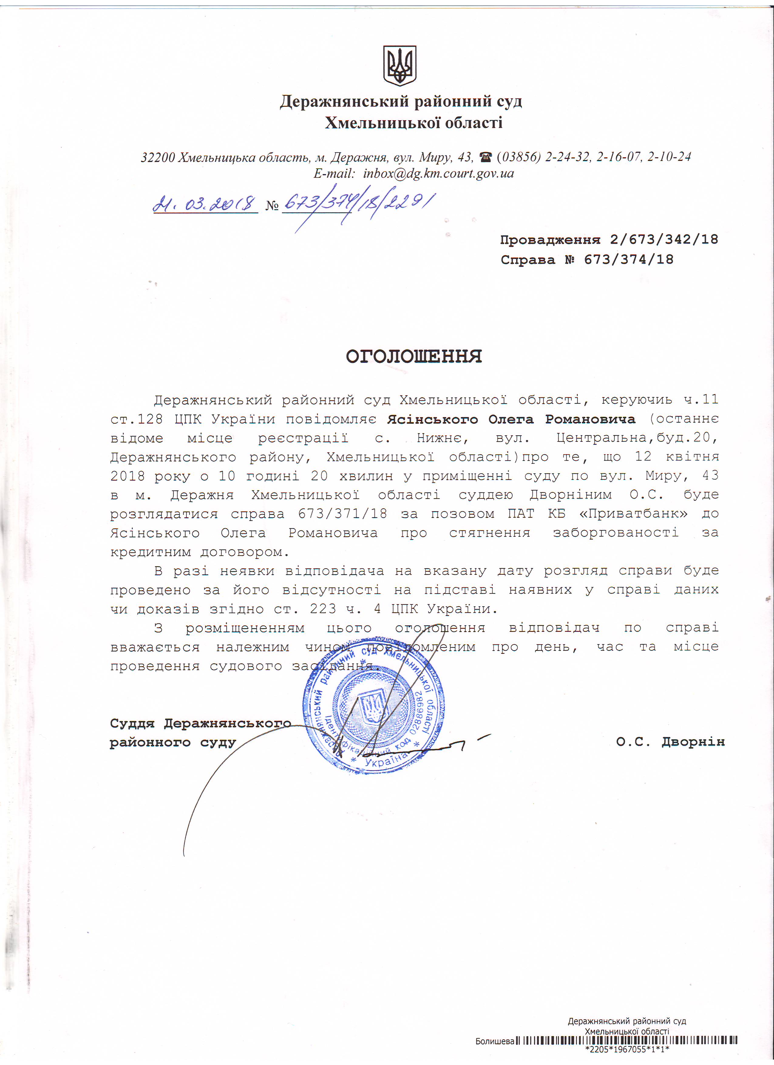 Викликають до суду Ясінського Олега Романовича