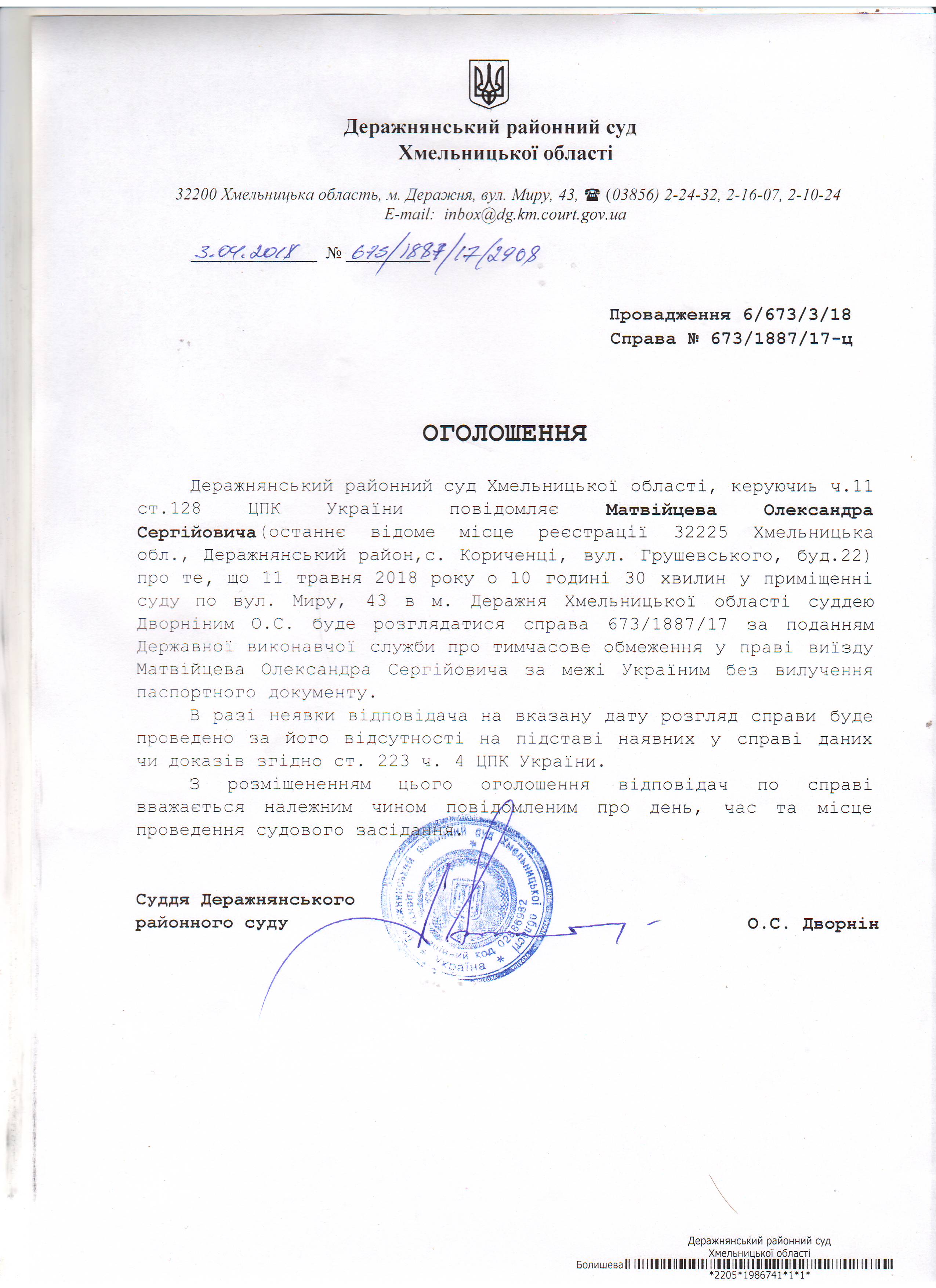 Деражнянський районний суд повідомляє Матвійцева Олександра Сергійовича