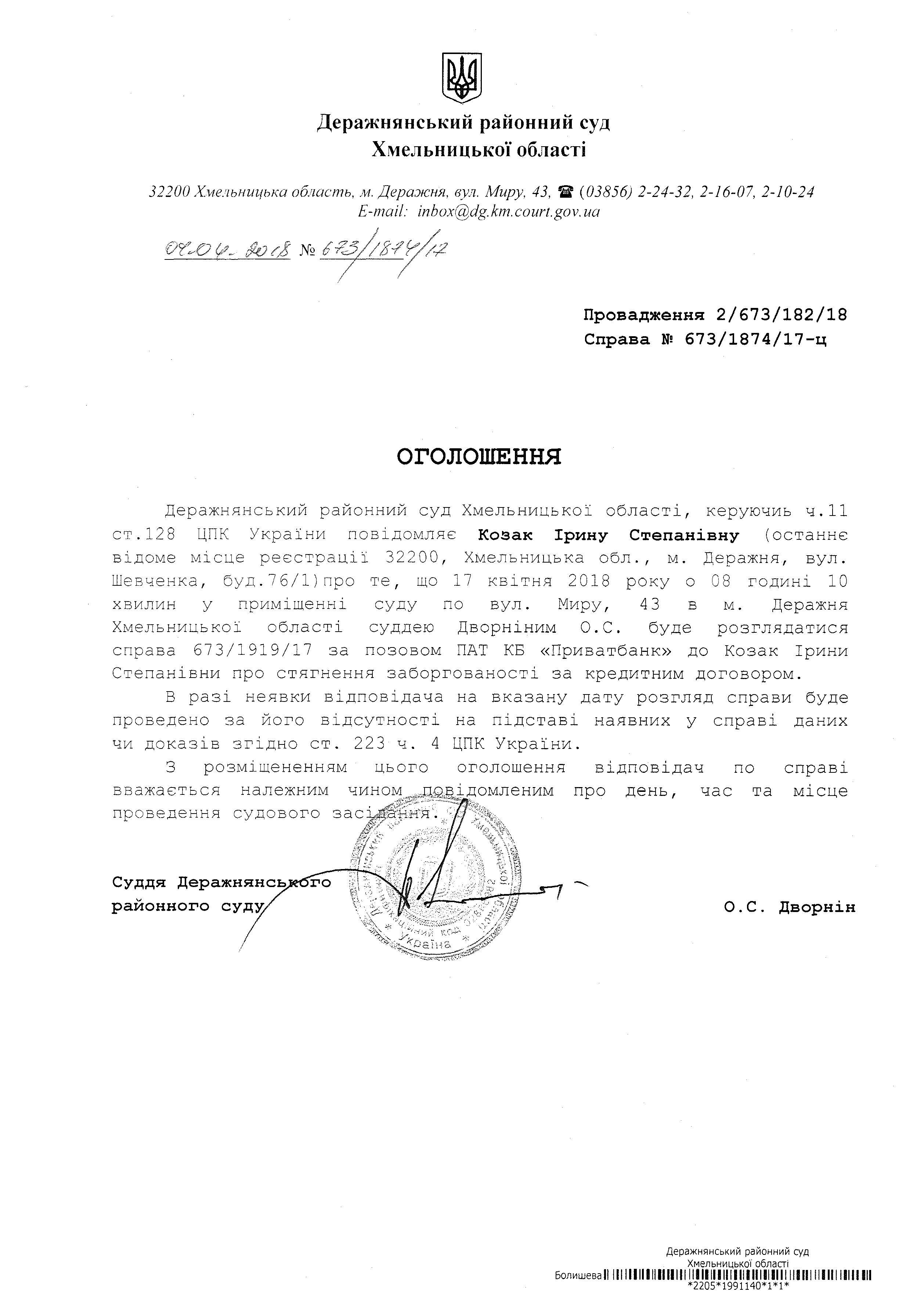 Деражнянський районний суд повідомляє Козак Ірину Степанівну