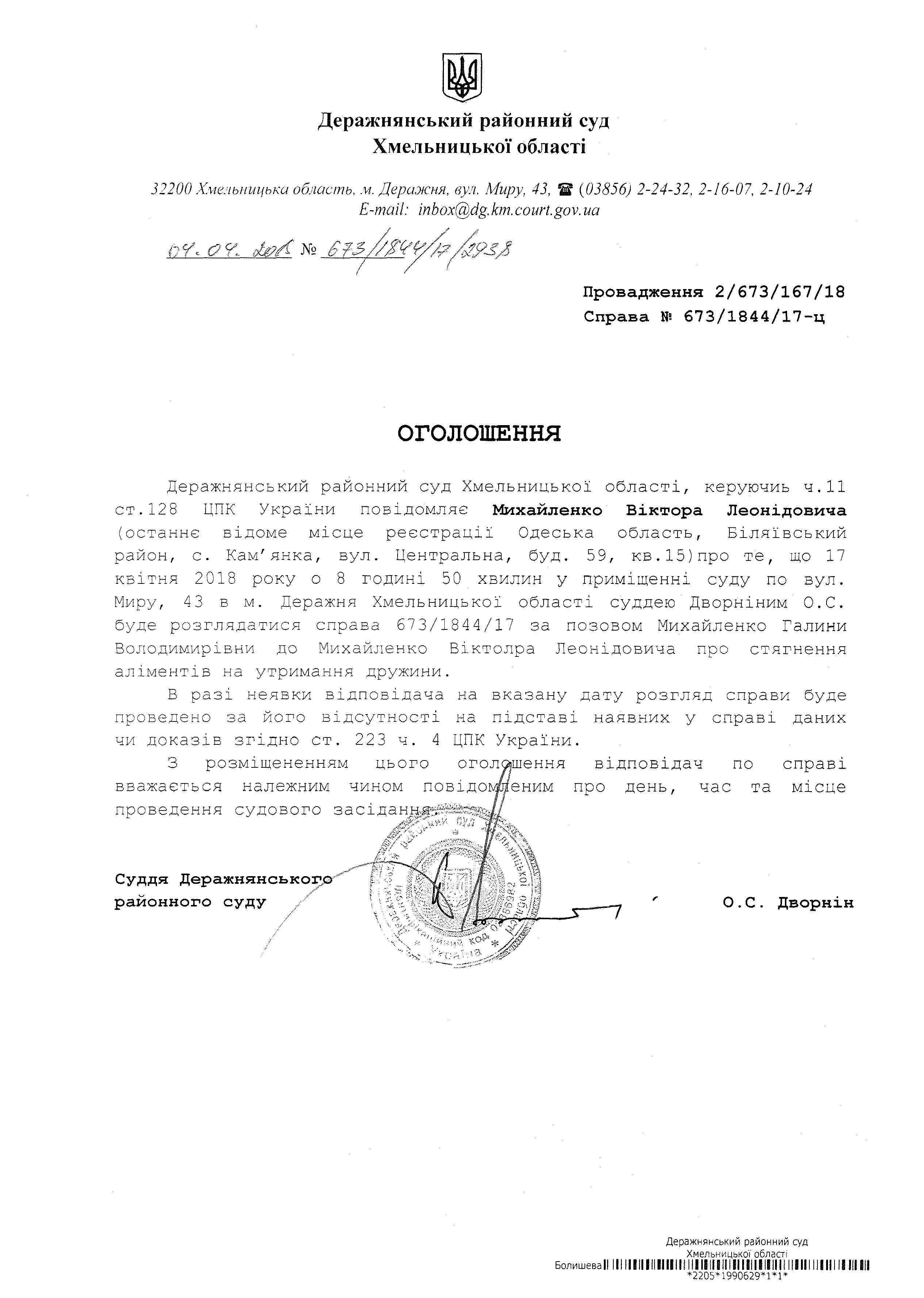 Деражнянський районний суд повідомляє Михайленко Віктора Леонідовича