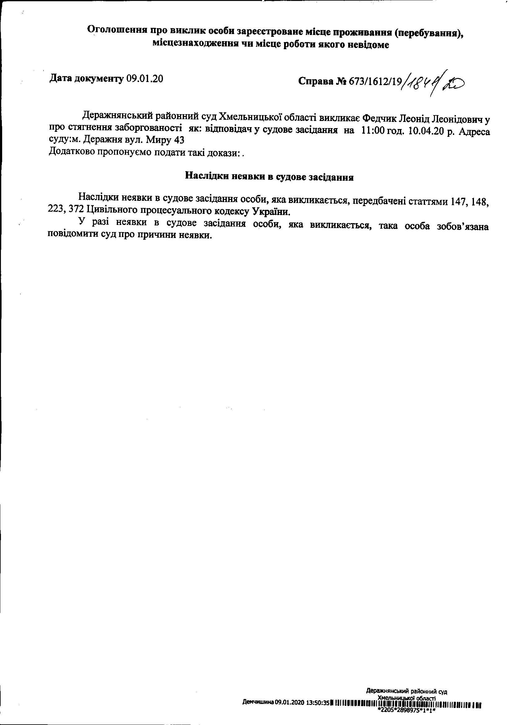 Викликається до суду Федчика Леоніда Леонідовича