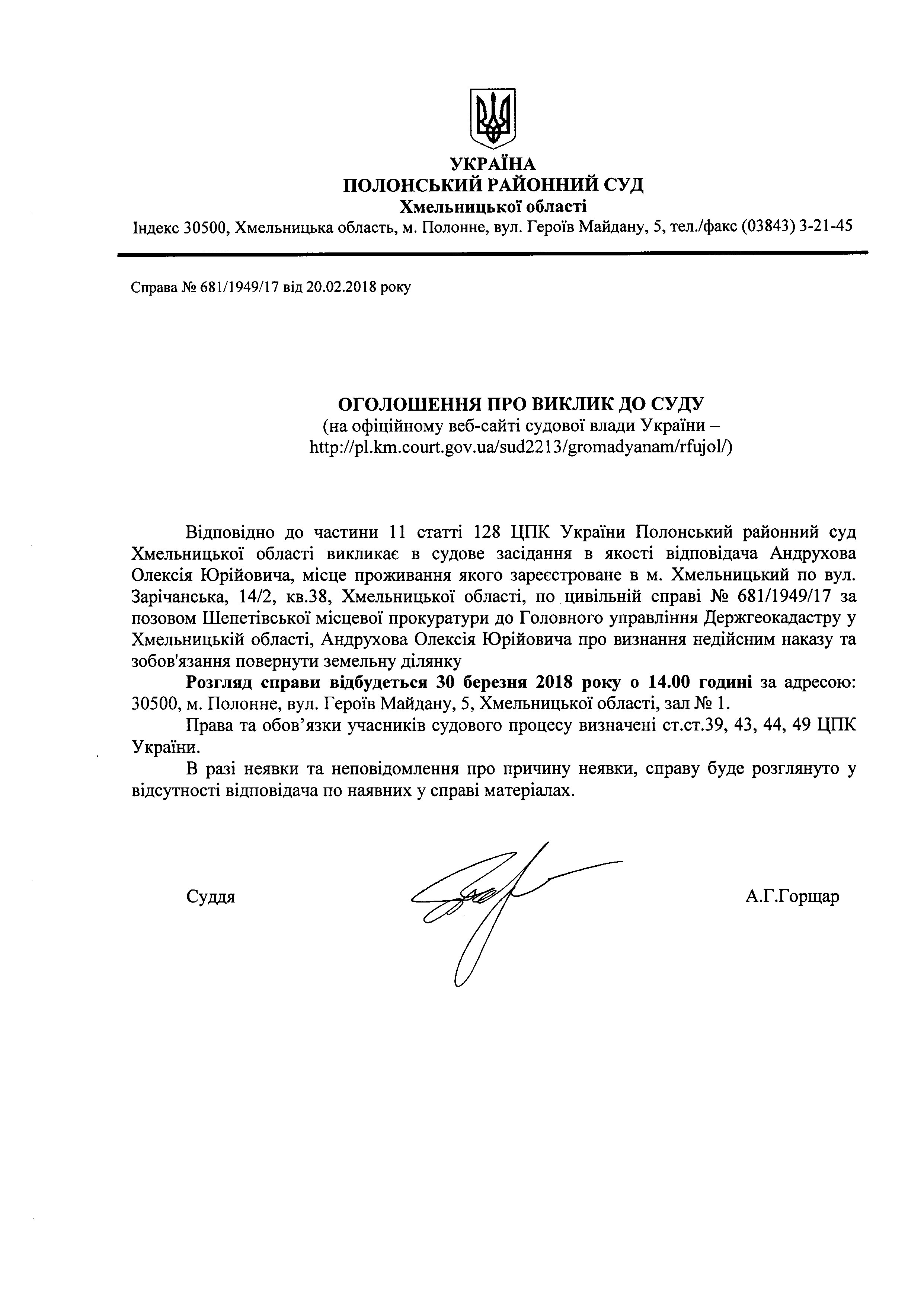 Оголошення про виклик до суду Андрухова Олексія Юрійовича