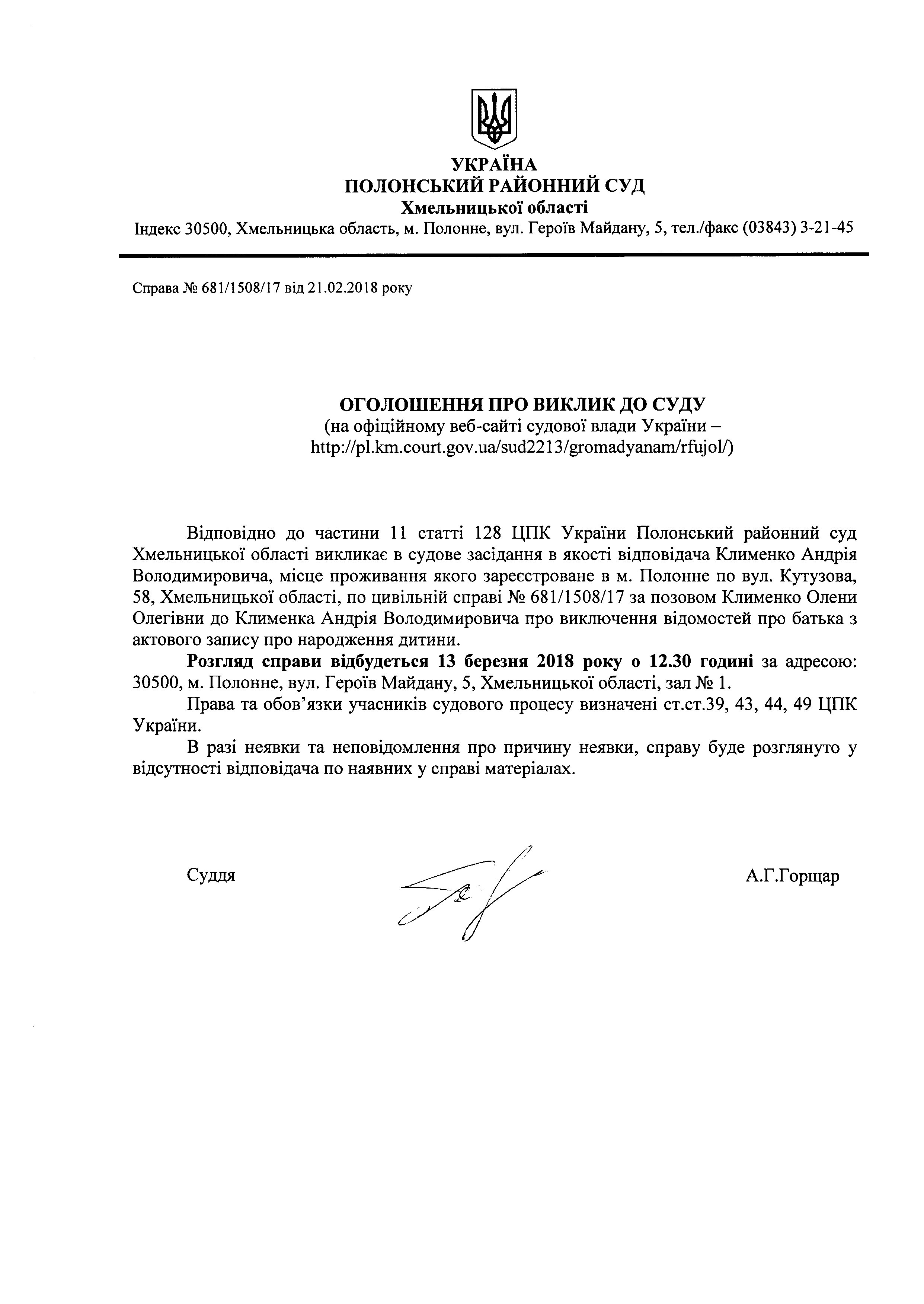 Оголошення про виклик до суду Клименка Андрія Володимировича