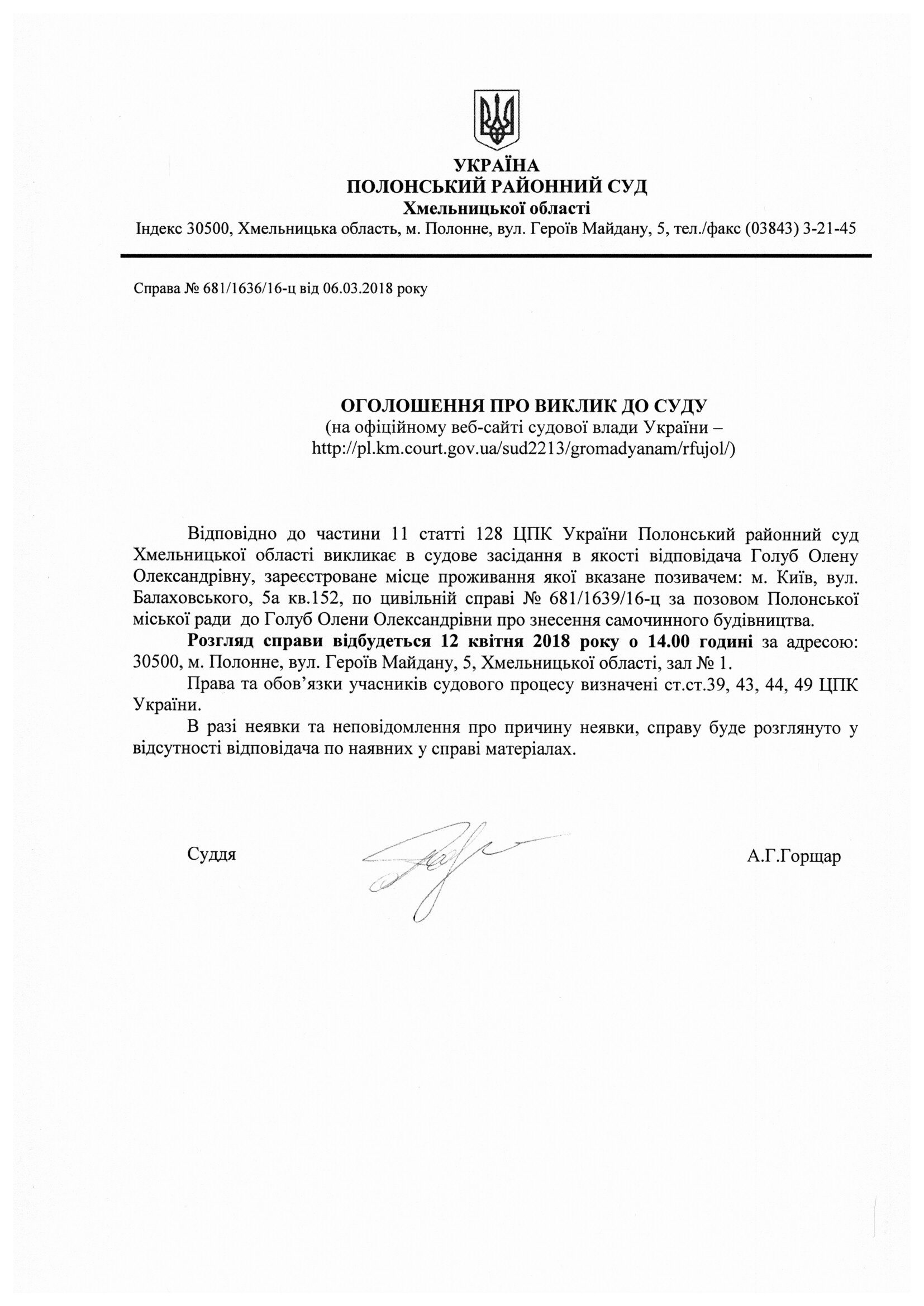 Оголошення про виклик до суду Голуб Олени Олександрівни