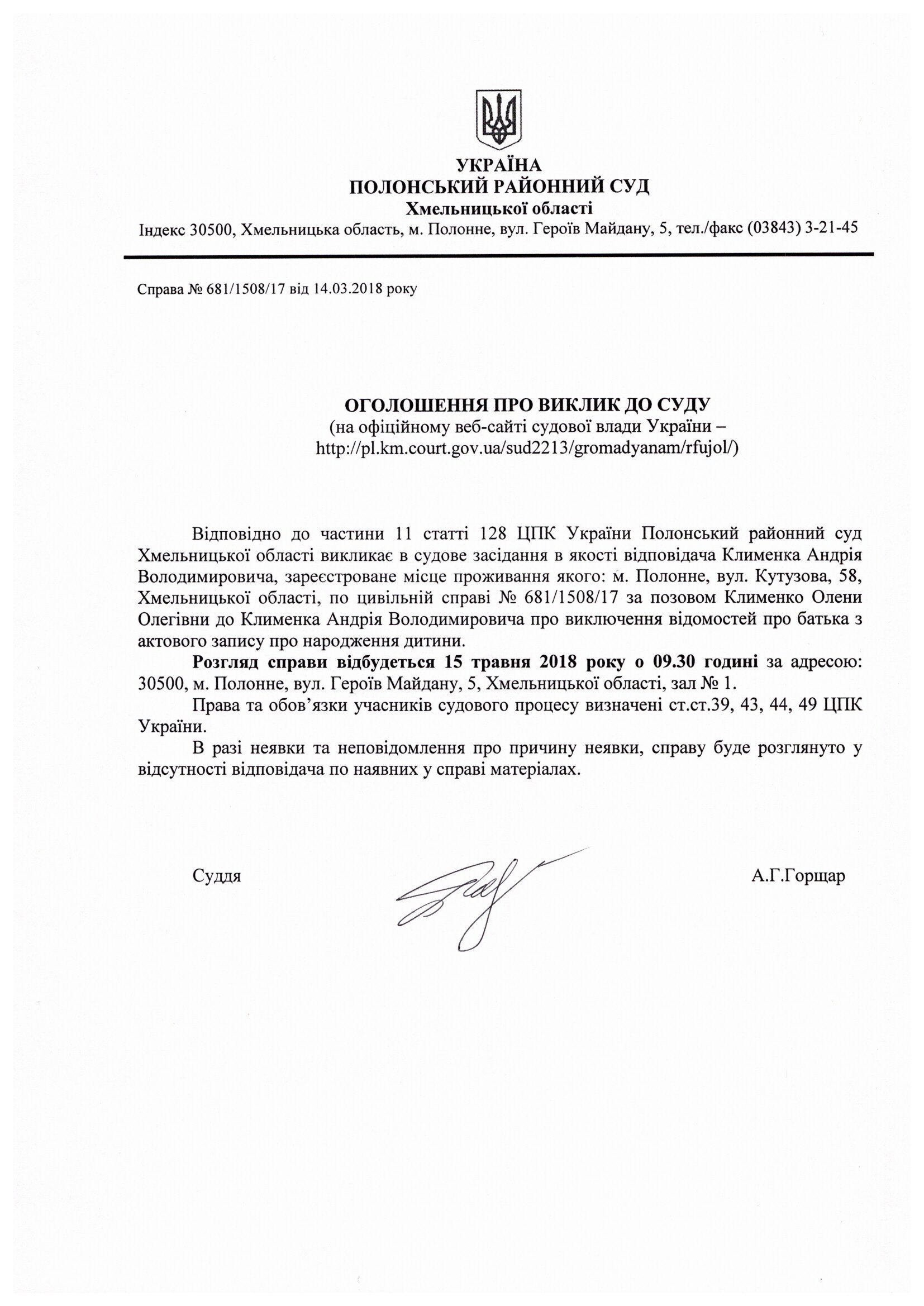 Оголошення про виклик до суду Клименка Андрія Володимировича