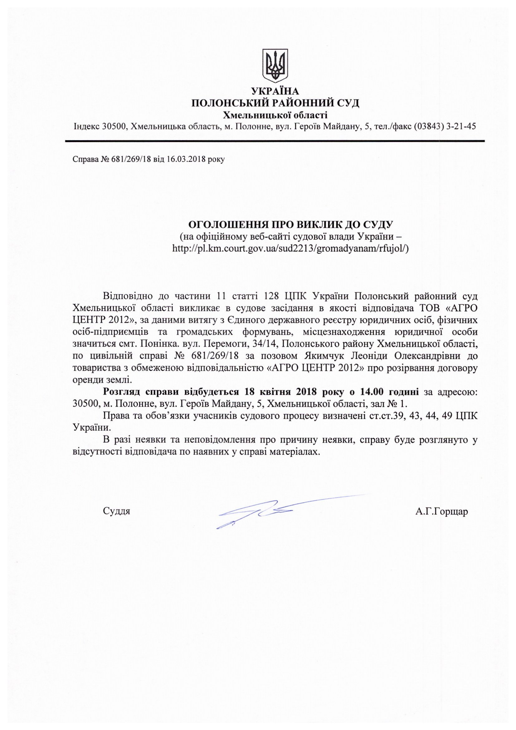 Оголошення про виклик до суду ТОВ "АГРО ЦЕНТР 2012"