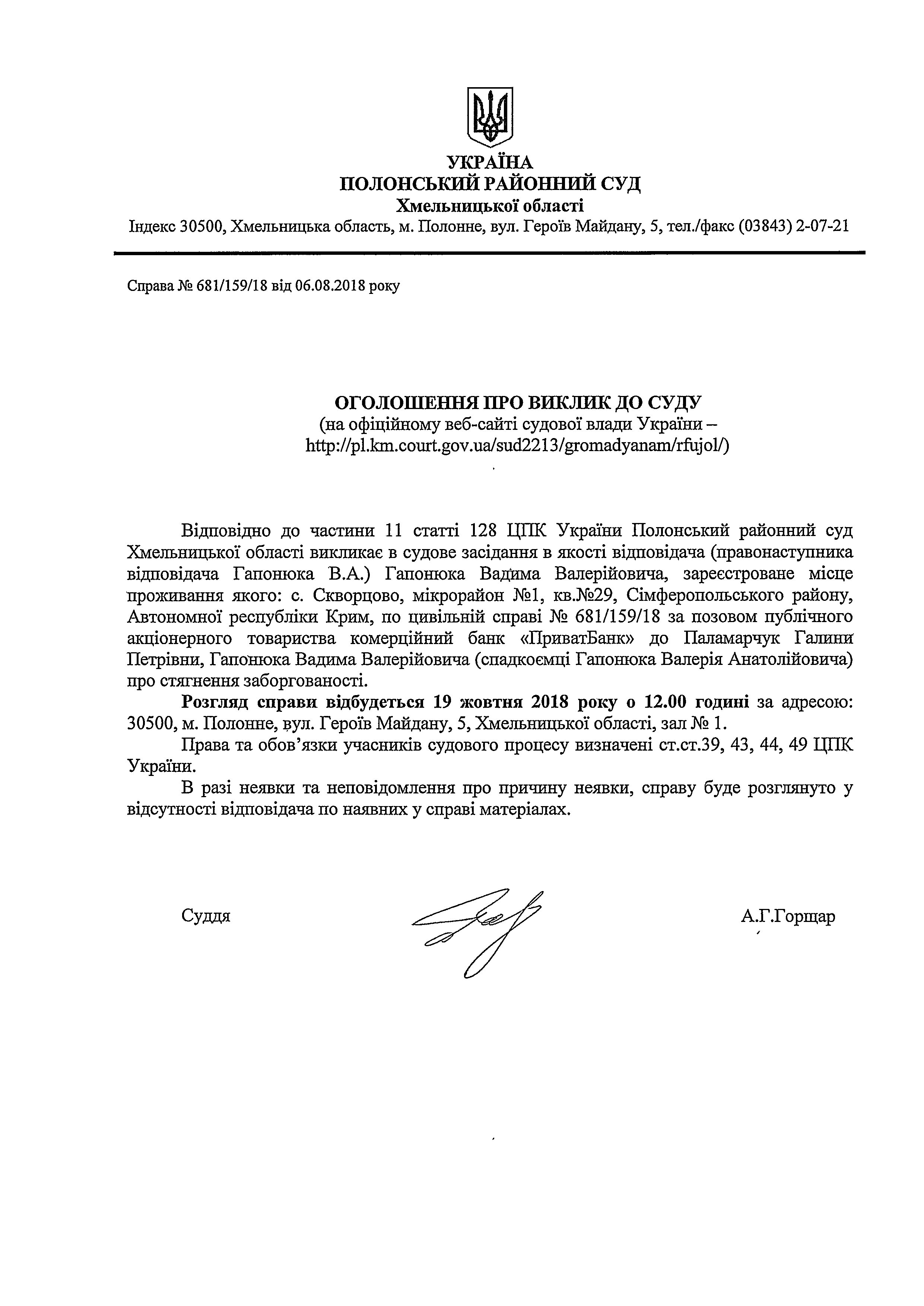 Оголошення про виклик до суду Гапонюка Вадима Валерійовича