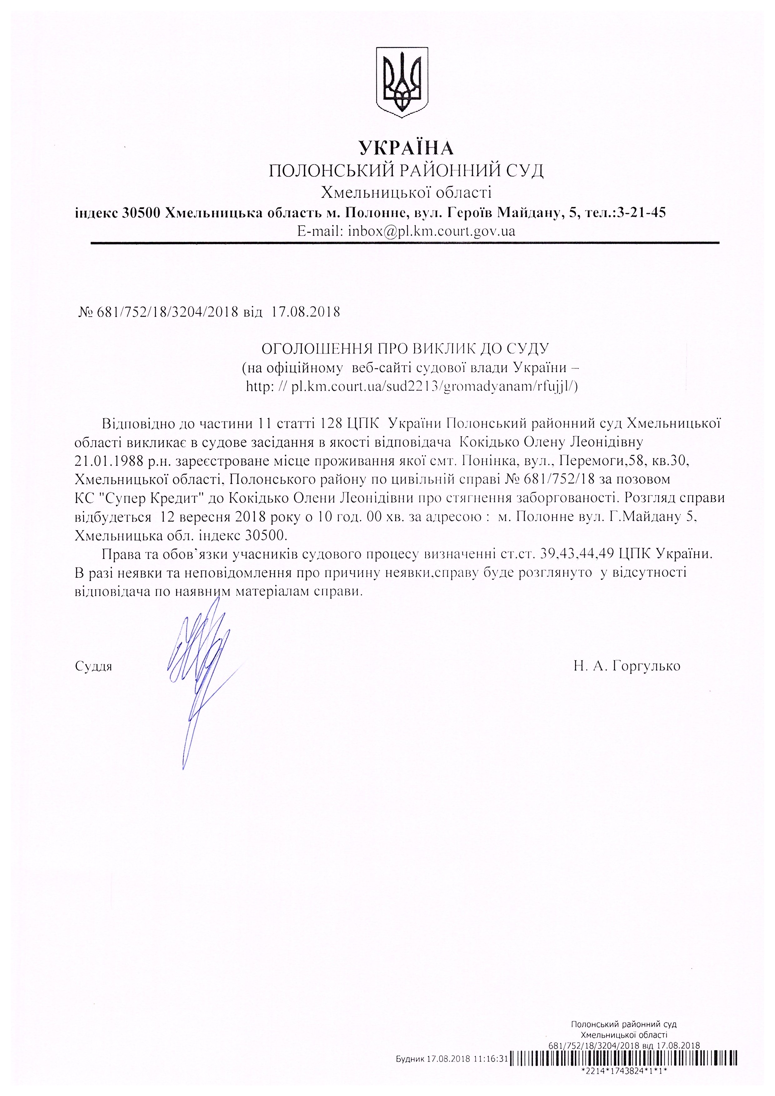 Оголошення про виклик до суду Кокідько Олени Леонідівни