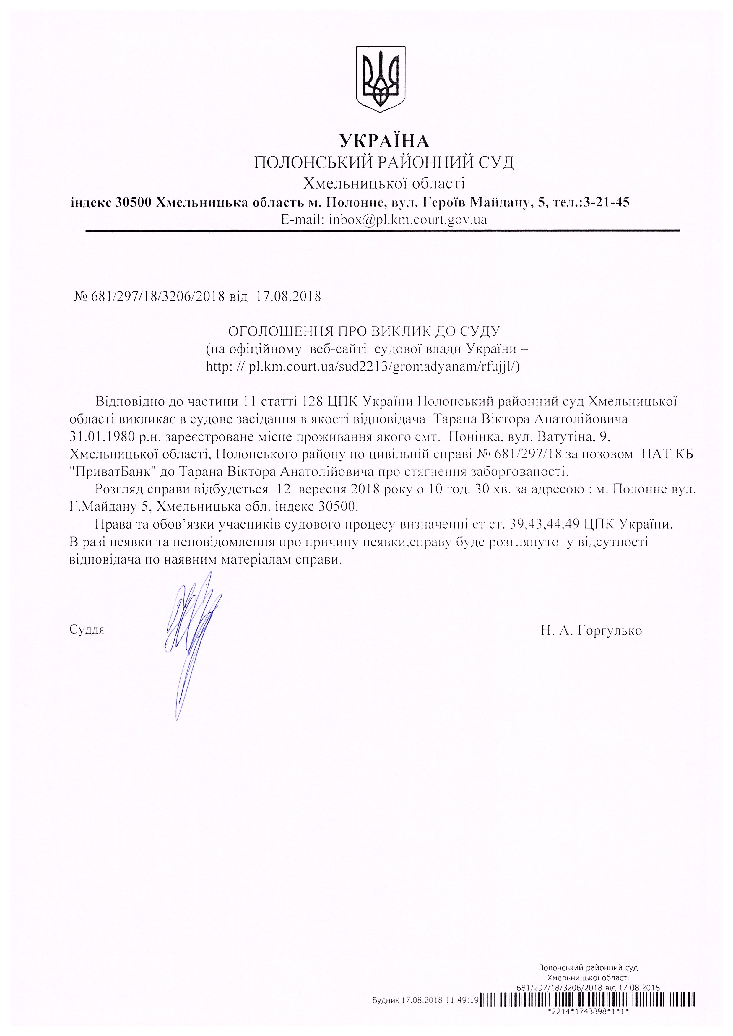 Оголошення про виклик до суду Тарана Віктора Анатолійовича