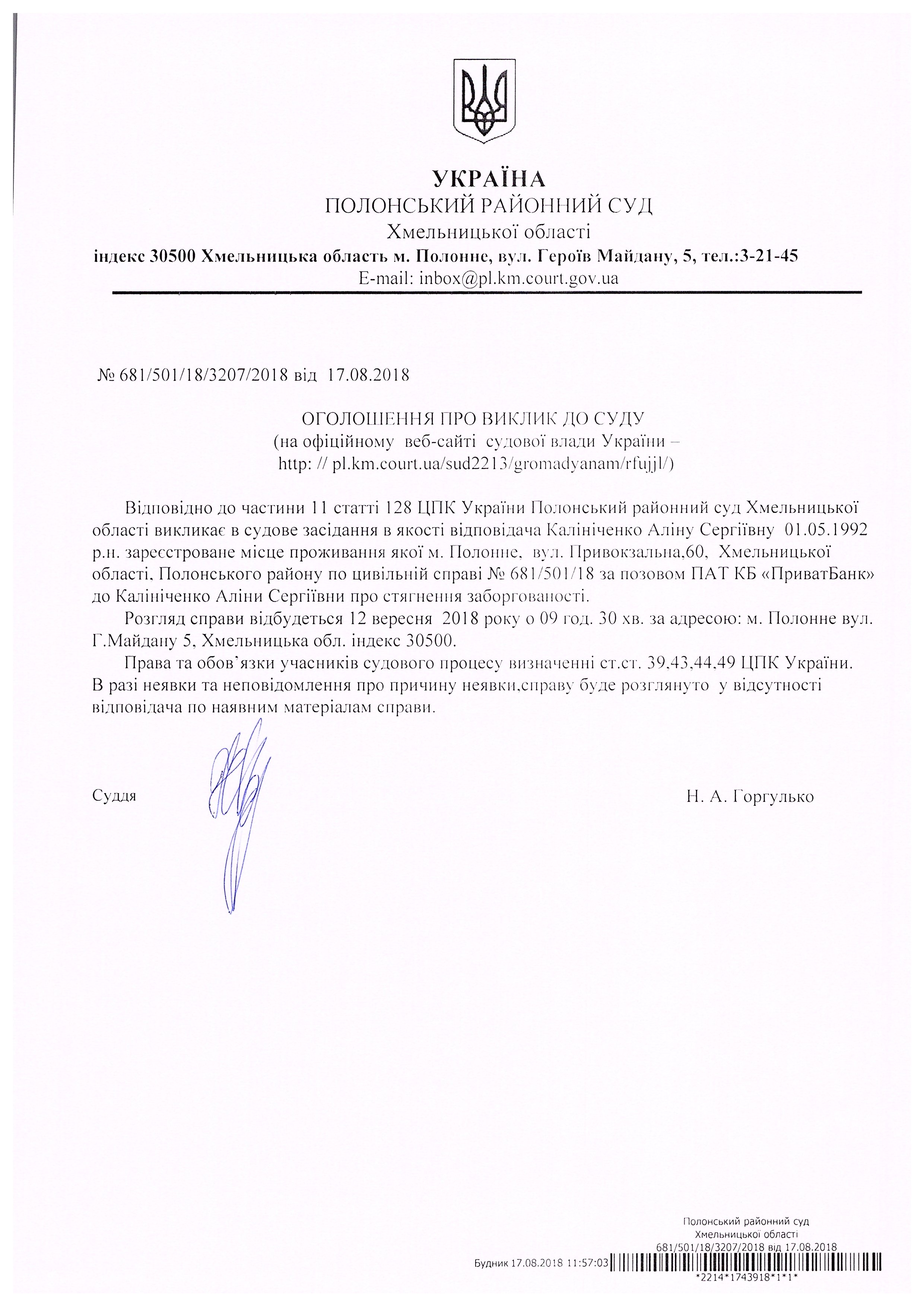 Оголошення про виклик до суду Калініченко Аліни Сергіївни