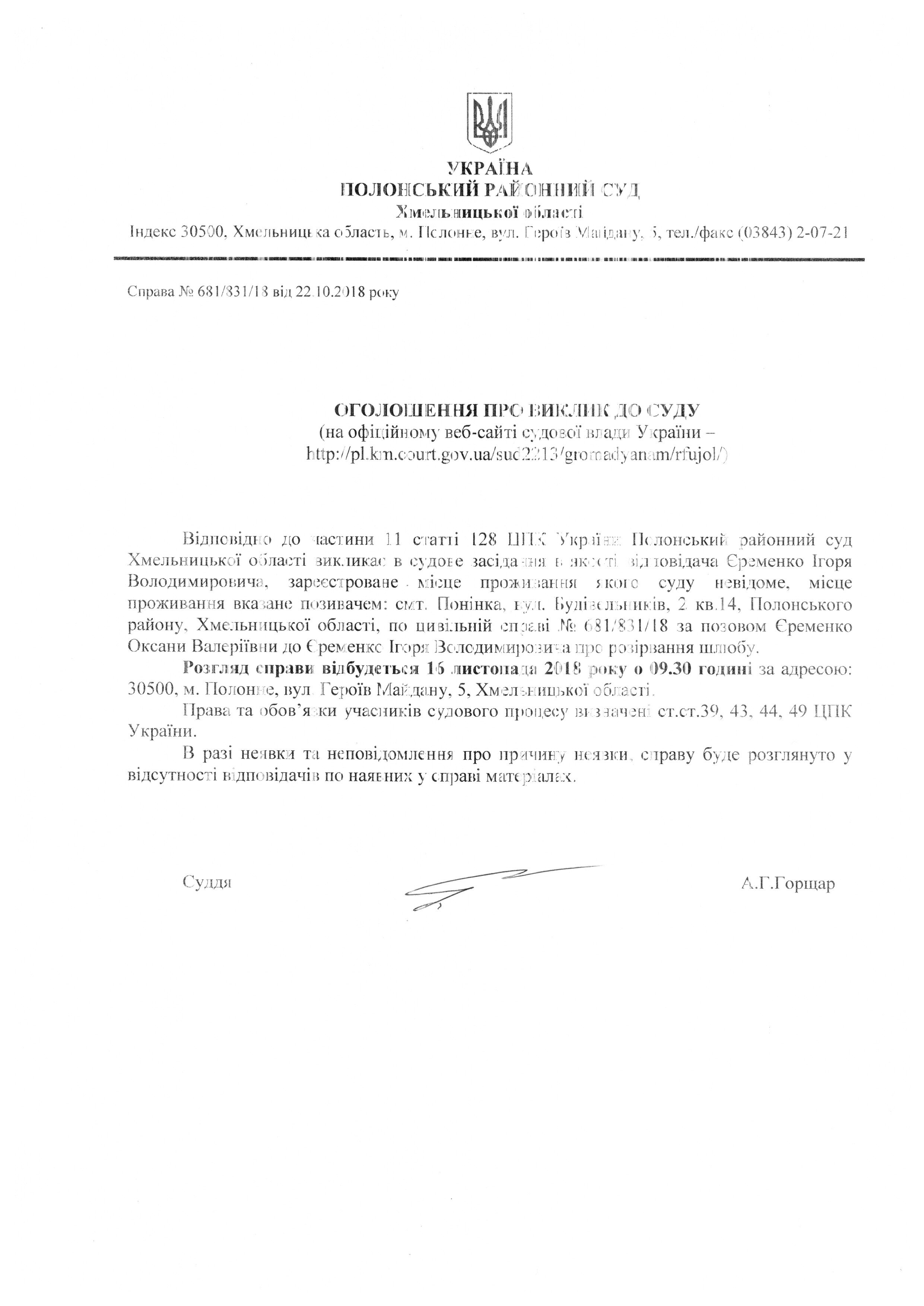 Оголошення про виклик до суду Єременко Ігоря Володимировича
