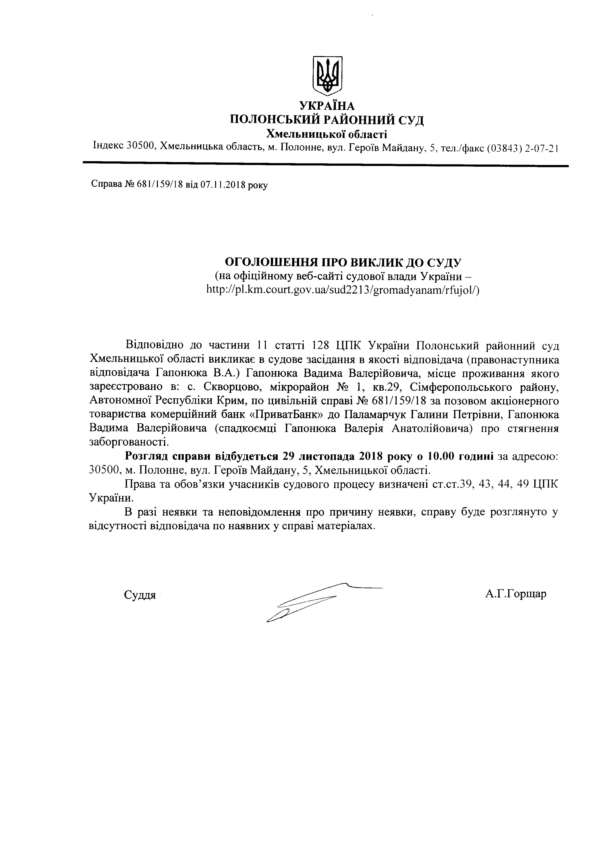 Оголошення про виклик до суду Гапонюка Вадима Валерійовича