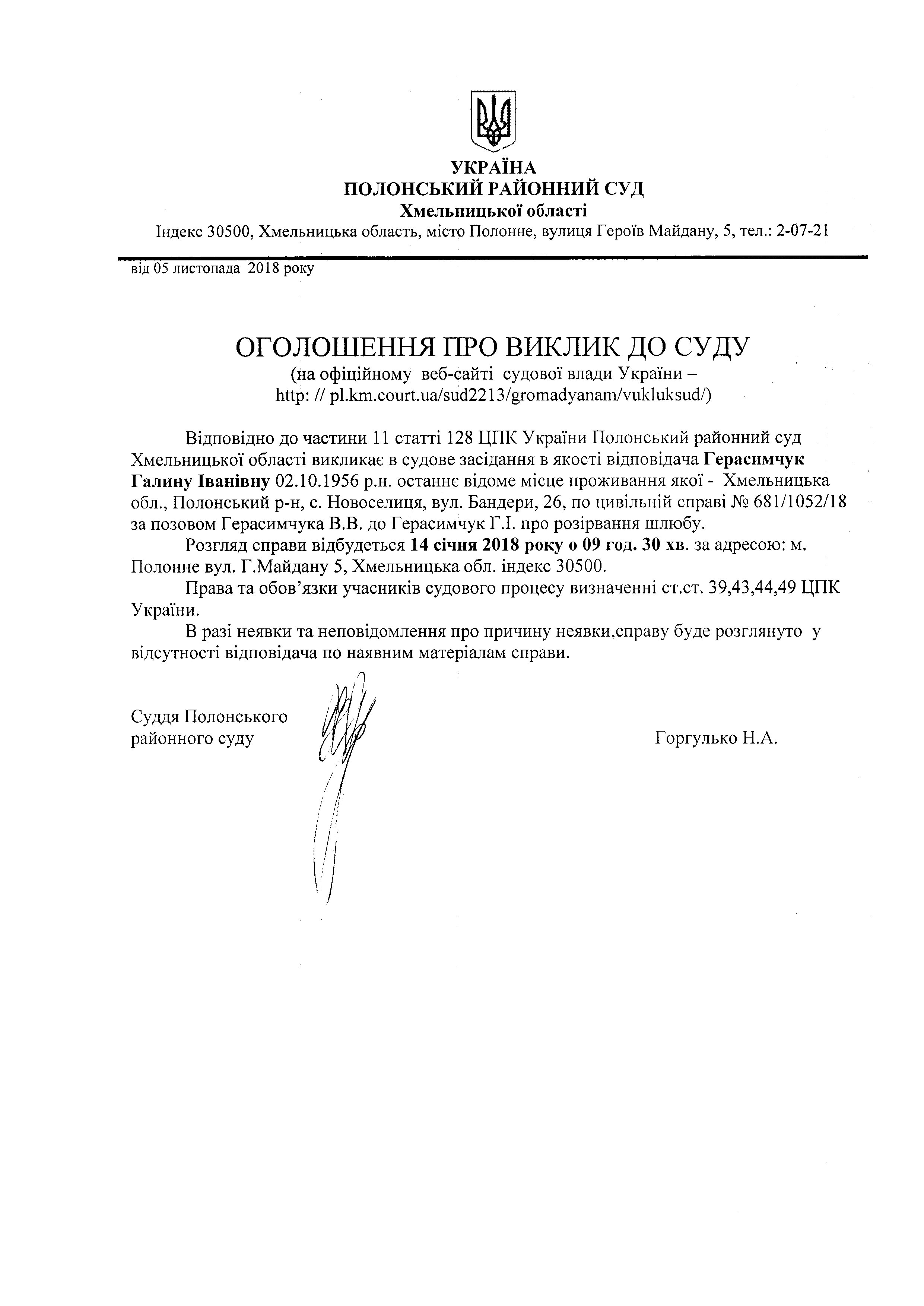 Оголошення про виклик до суду Герасимчук Галини Іванівни