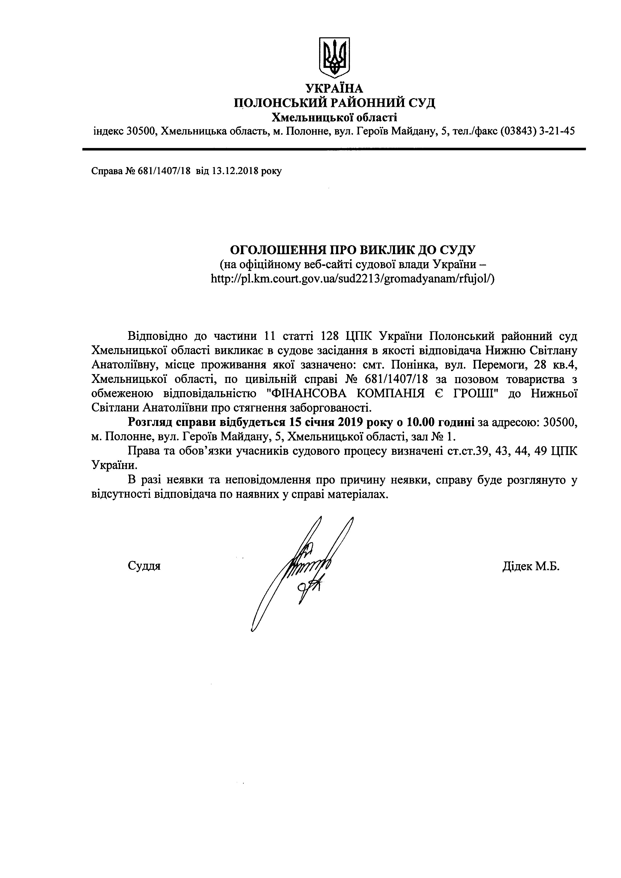 Оголошення про виклик до суду Нижньої Світлани Анатоліївни