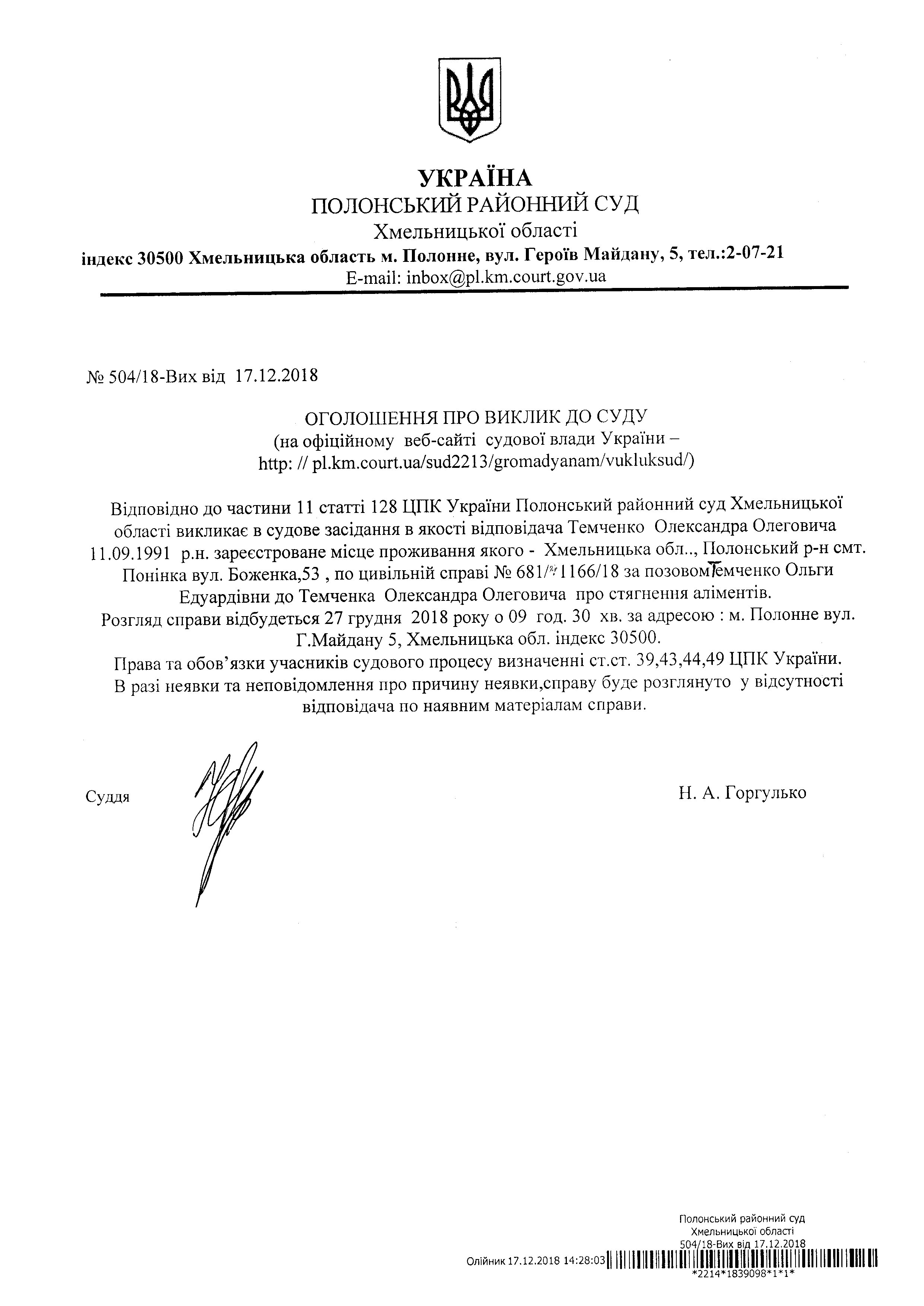 Оголошення про виклик до суду Темченко Олександра Олеговича