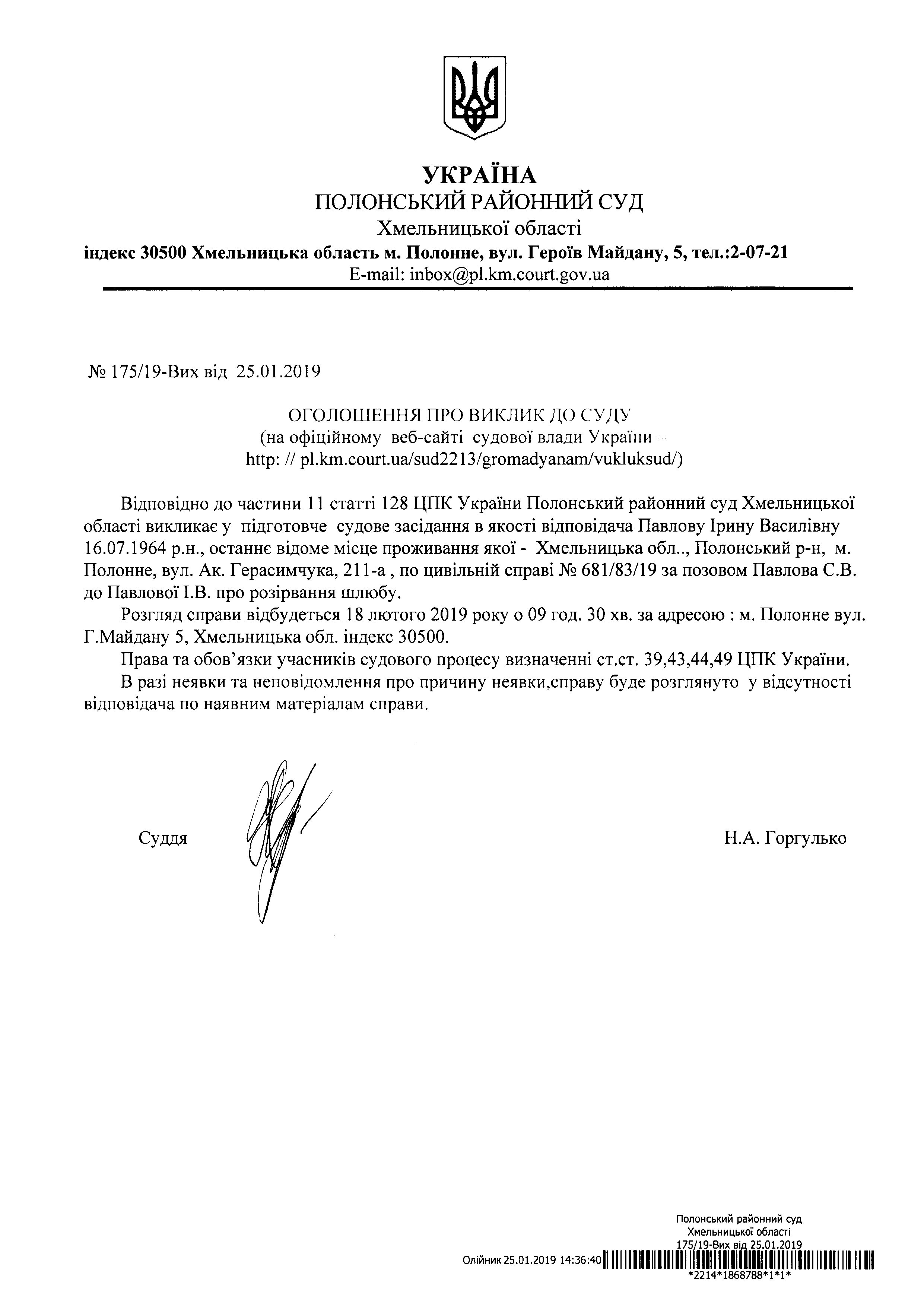 Оголошення про виклик до суду Павлову Ірину Василівну