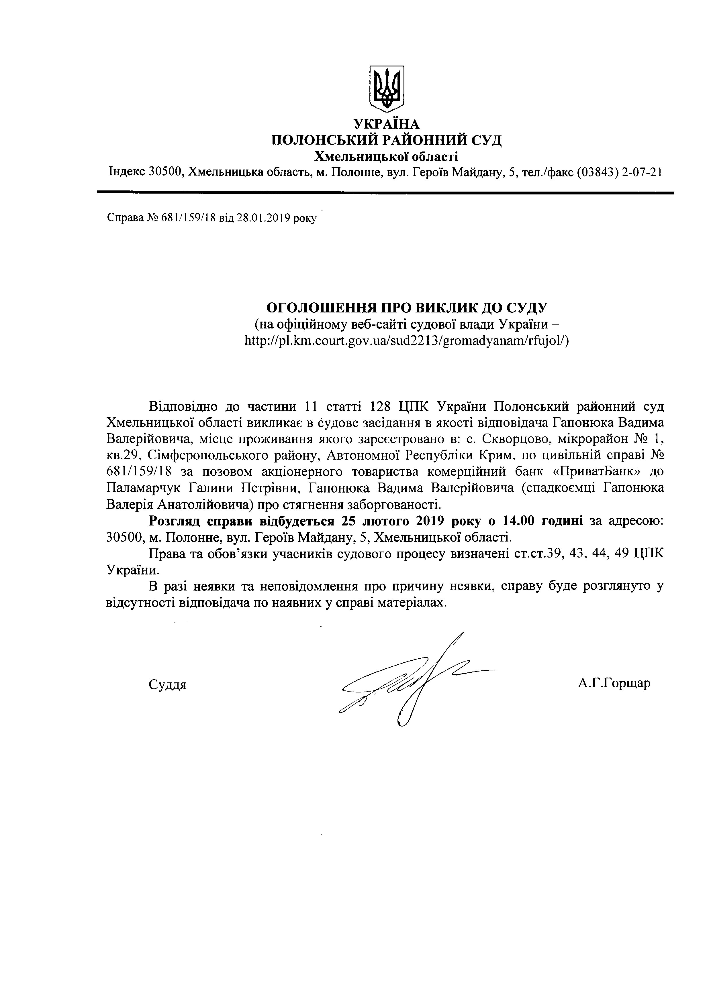 Оголошення про виклик до суду Гапонюка Вадима Валерійовича