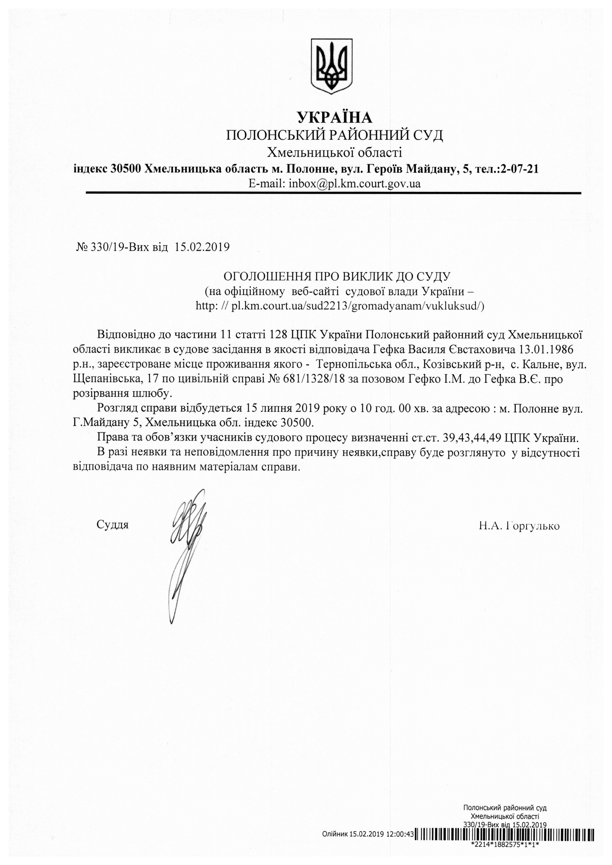 Оголошення про виклик до суду Гефка Василя Євстаховича