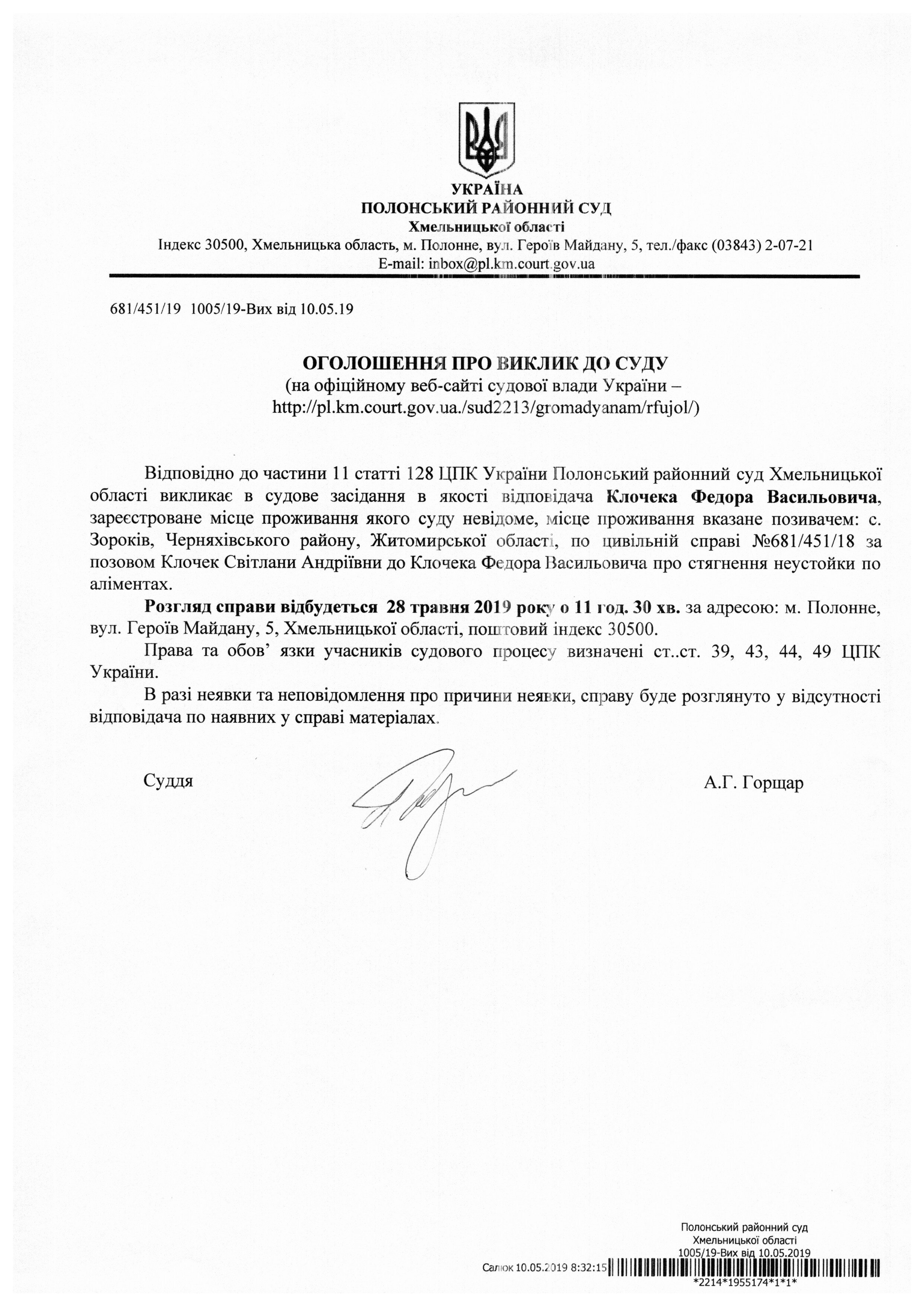 Оголошення про виклик до суду Клочека Федора Васильовича