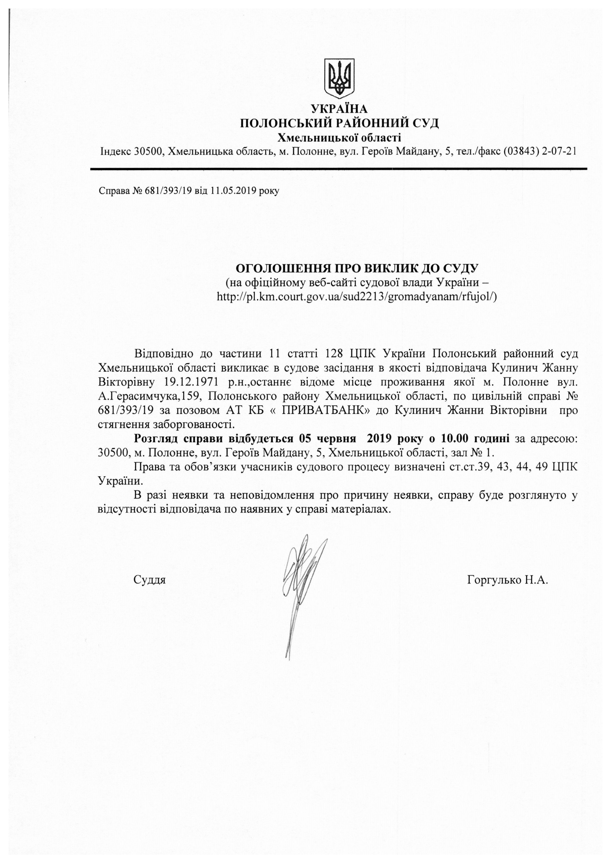Оголошення про виклик до суду Кулинич Жанни Вікторівни