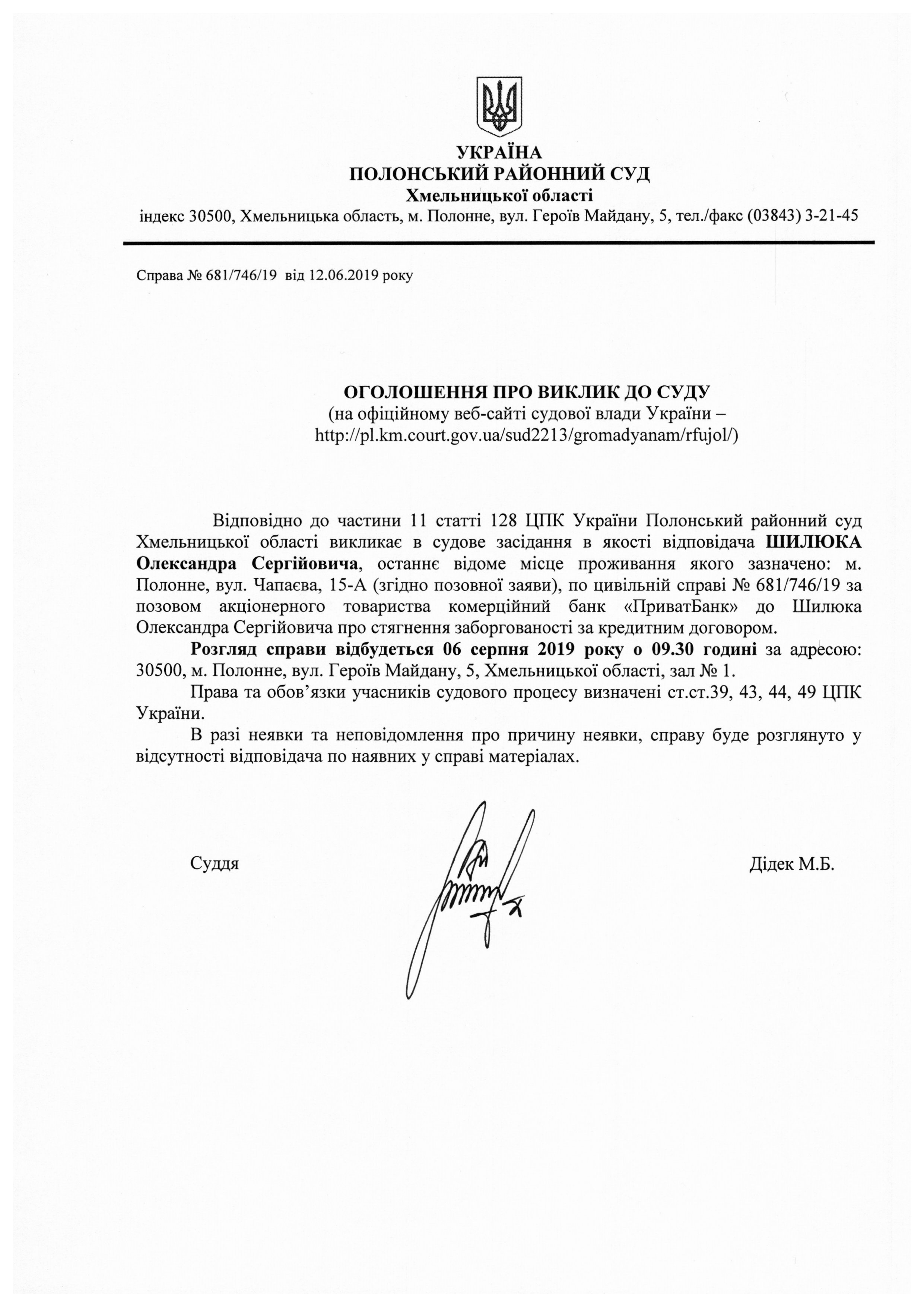Оголошення про виклик до суду Шилюка Олександра Сергійовича