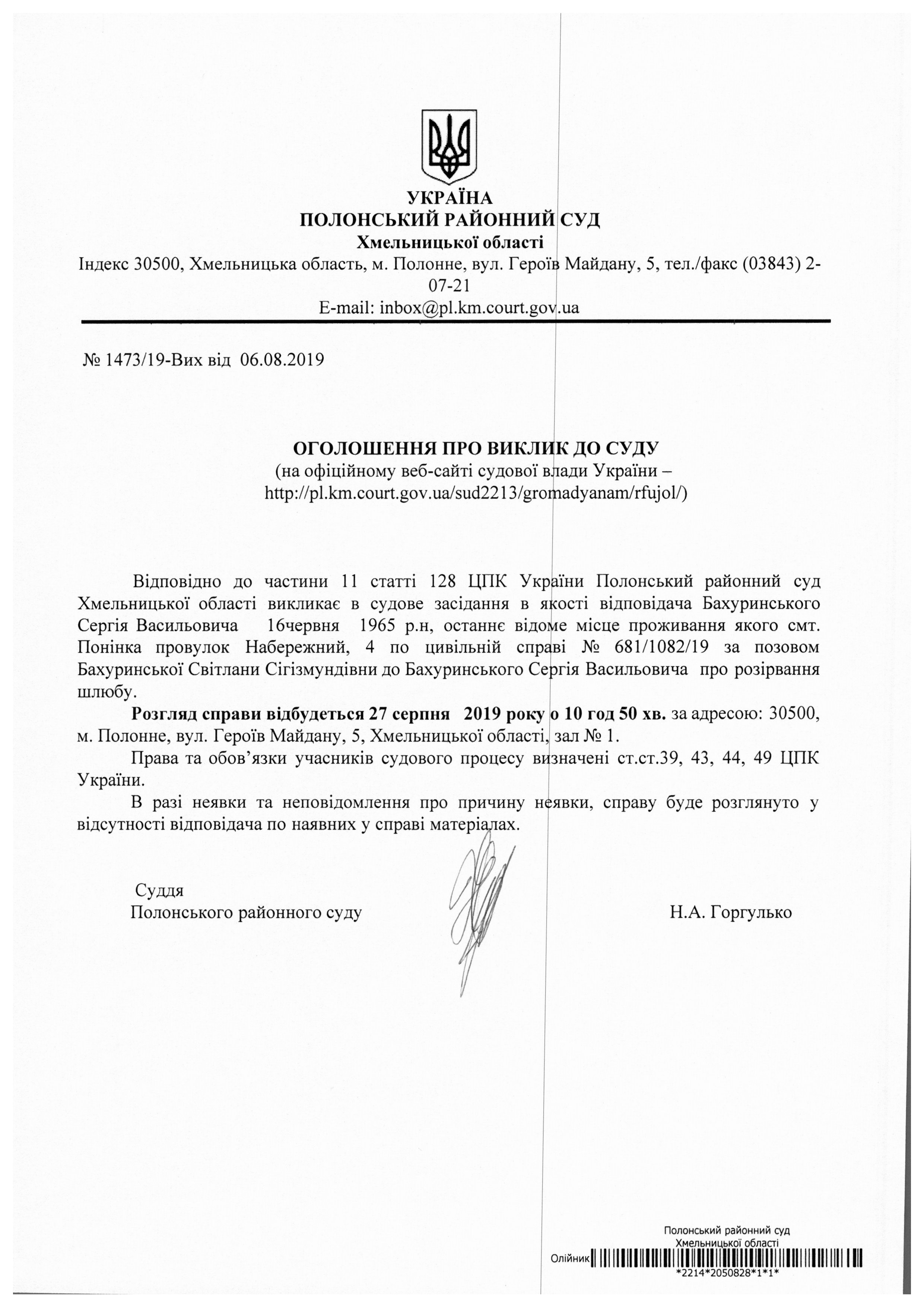 Оголошення про виклик до суд Бахуринського Сергія Васильовича