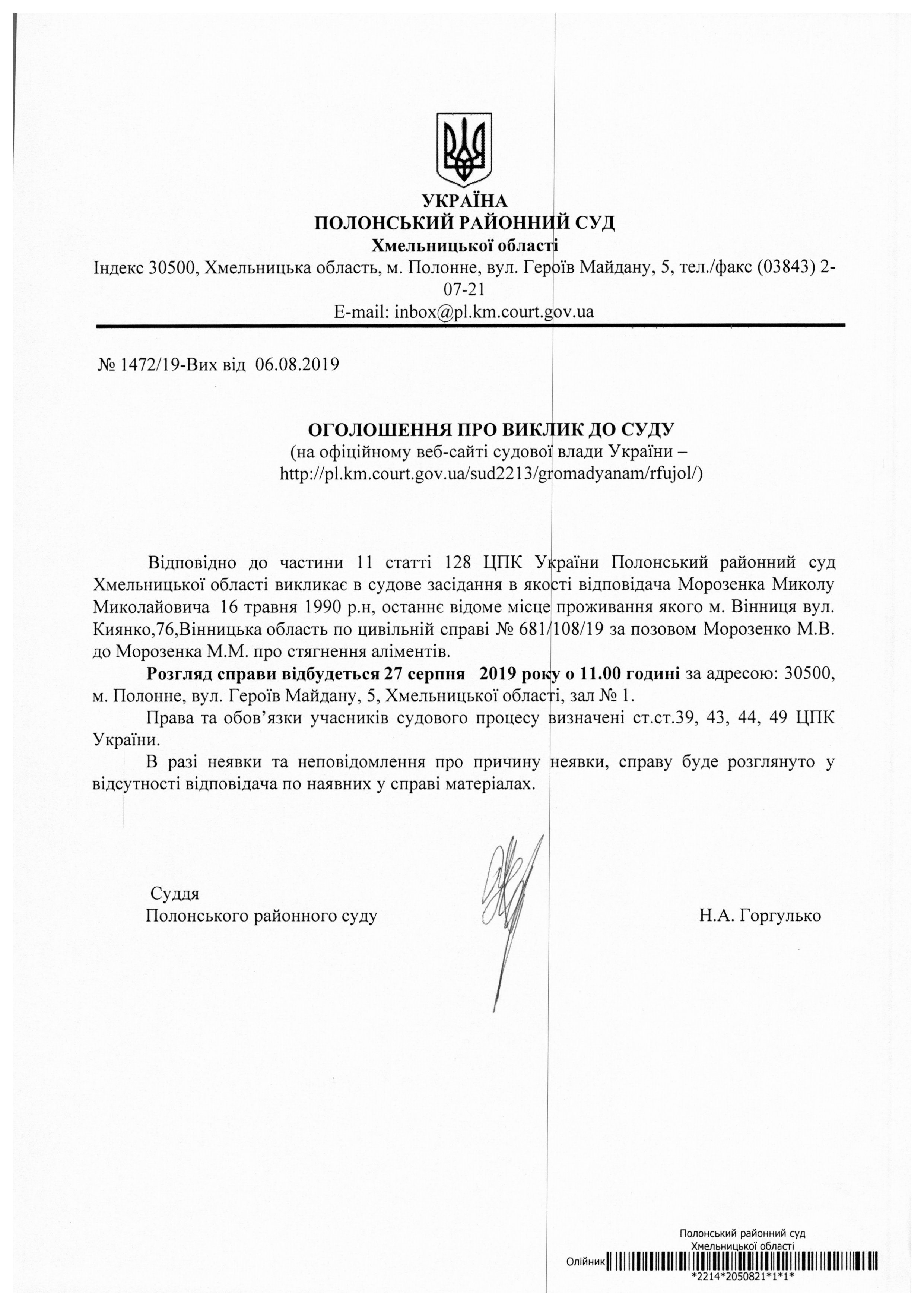Оголошення про виклик до суду Морозенка Миколи Миколайовича