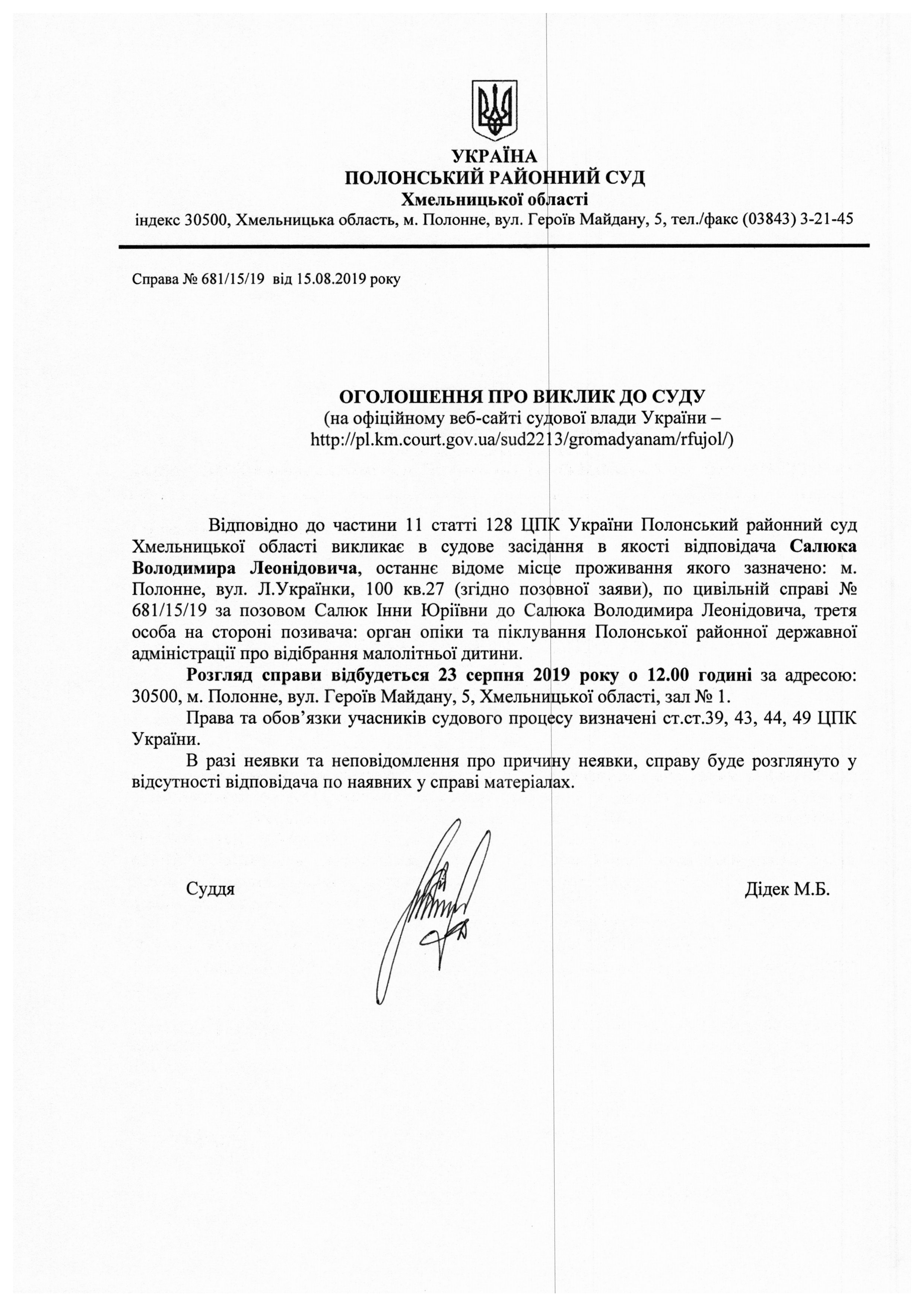 Оголошення про виклик до суду Салюка Володимира Леонідовича