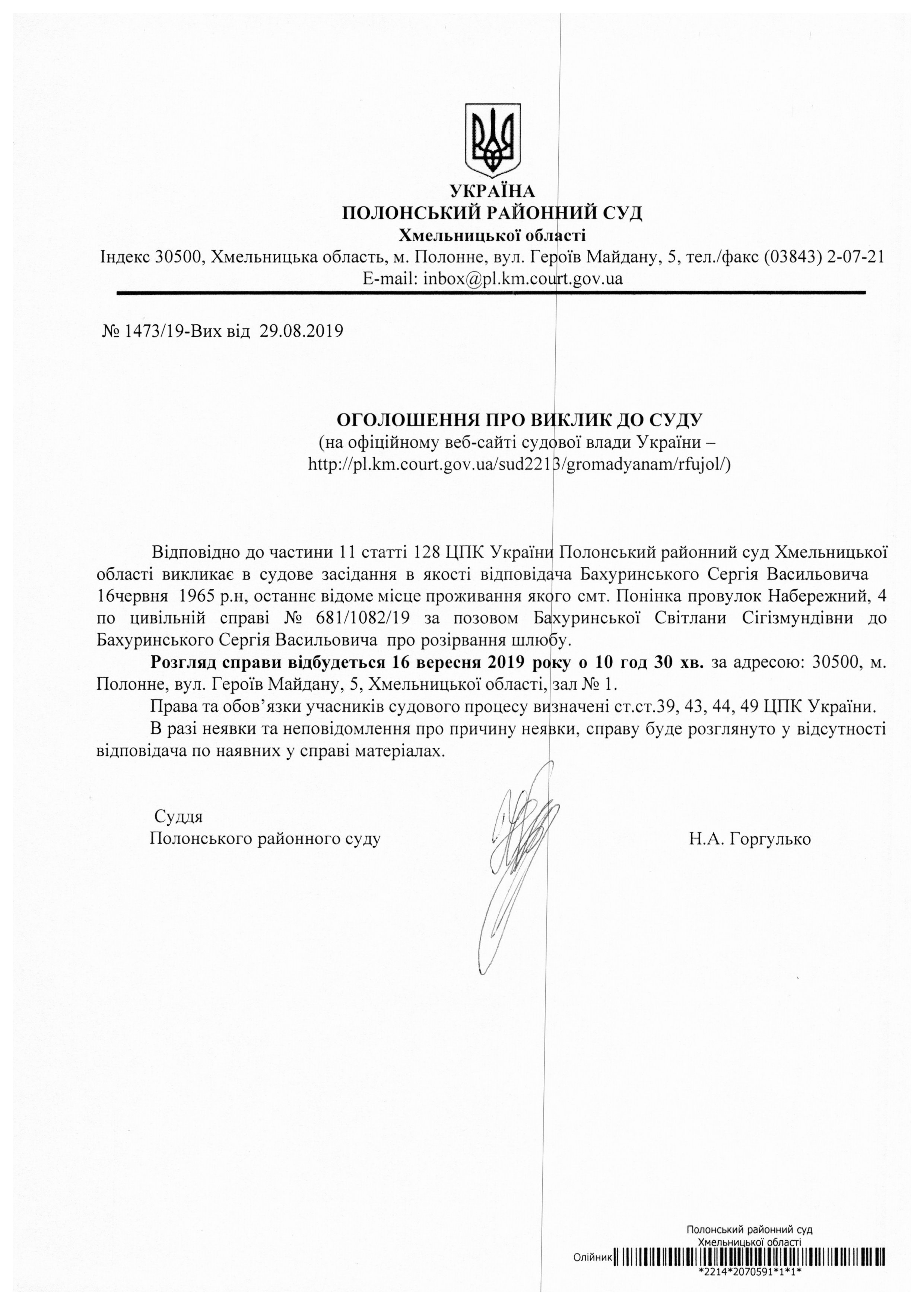 Оголошення про виклик до суду Бахуринського Сергія Васильовича