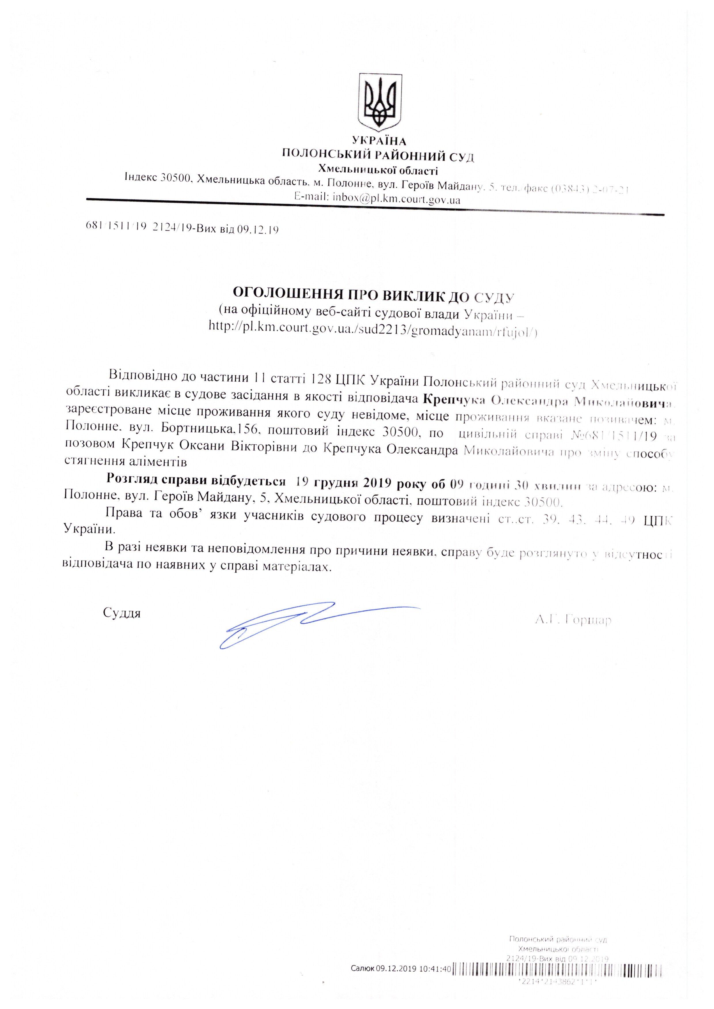 Оголошення про виклик до суду Крепчука Олександра Миколайовича