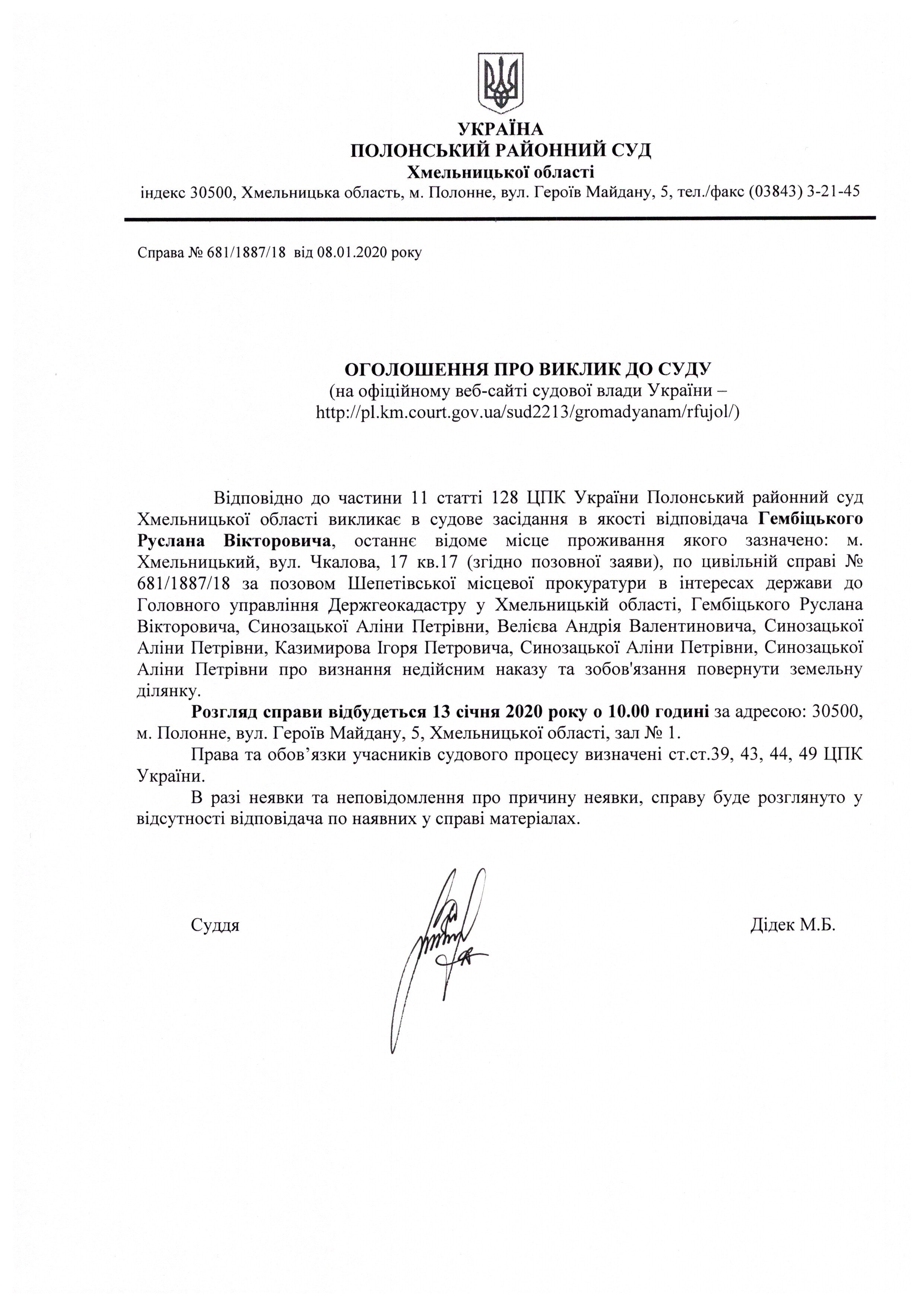 Оголошення про виклик до суду Гембіцького Руслана Вікторовича