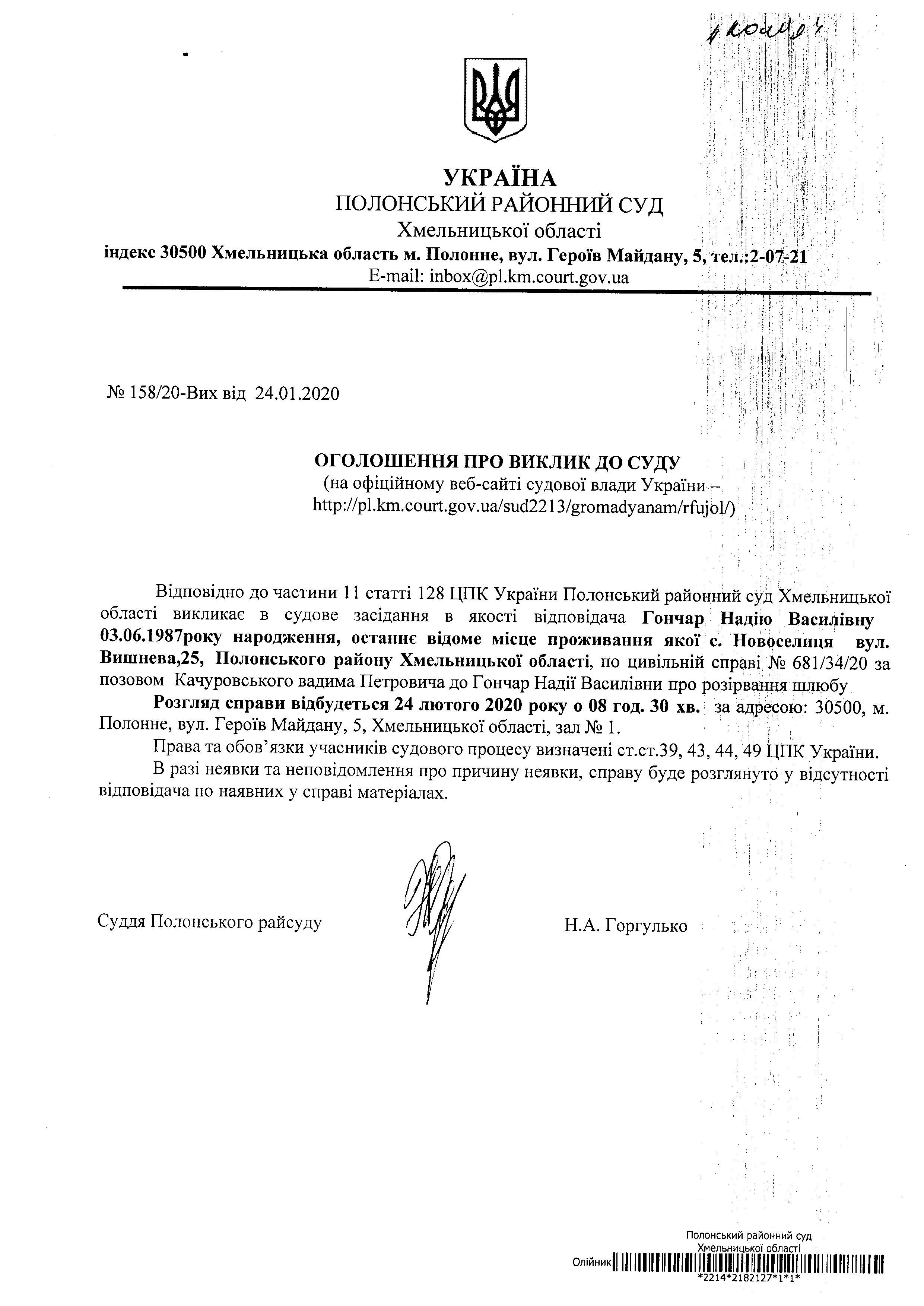 Оголошення про виклик до суду Гончар Надії Василівни