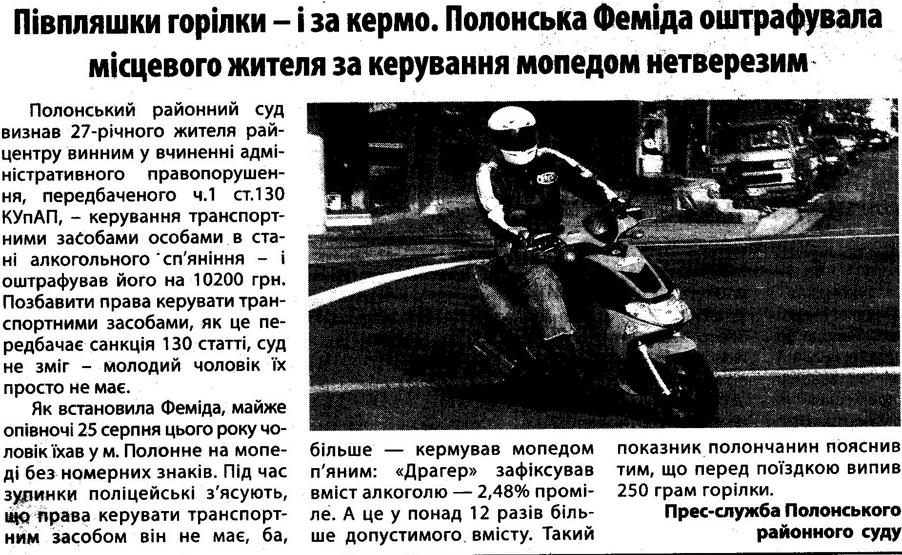 Пів пляшки горілки - і за кермо. Полонська Феміда оштрафувала місцевого жителя за керування мопедом нетверезим
