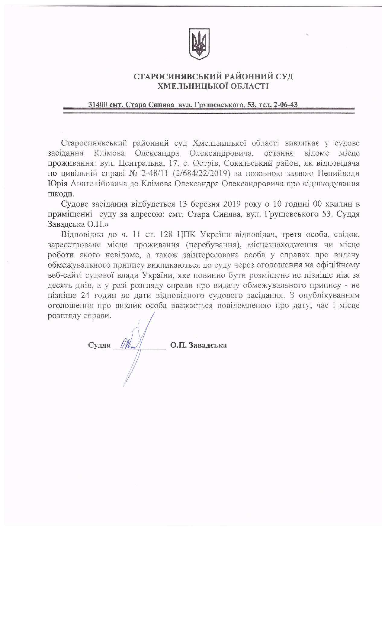 Оголошення про виклик до суду Клімова Олександра Олександровича