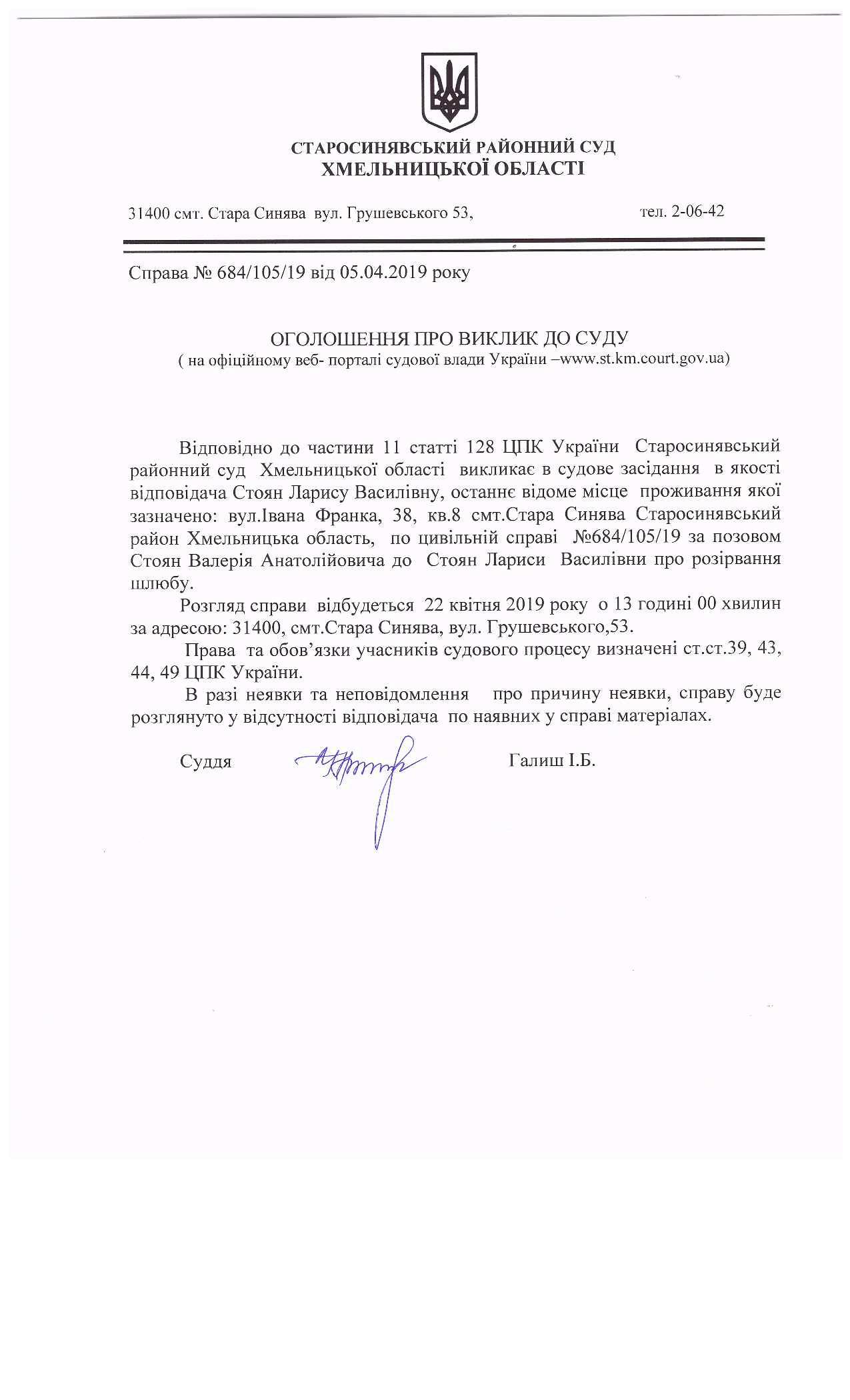 Оголошення про виклик до суду Стоян Ларису Василівну